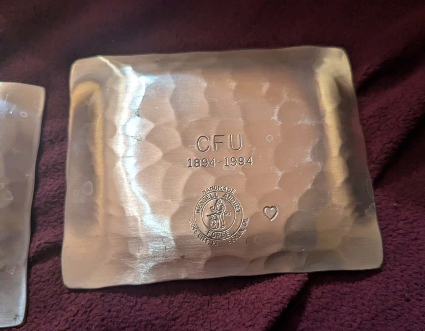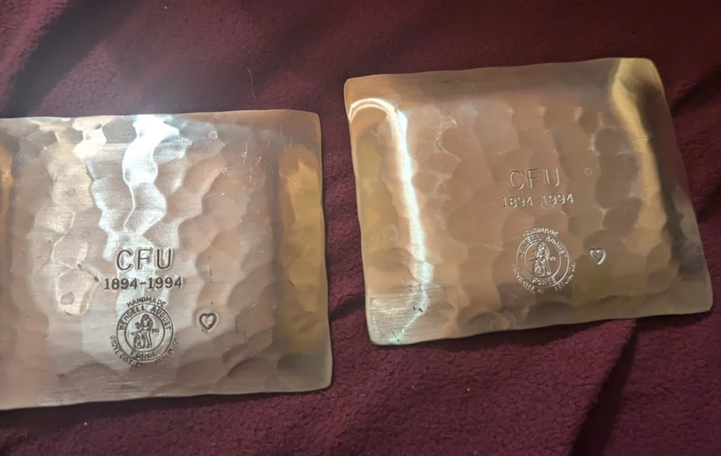 Selling two handmade dishes from Wendell August Forge. One features the CFU building, and the other has the CFU logo and dates 1894-1994. They are in good condition and have a unique, hammered texture price is for the pair of them