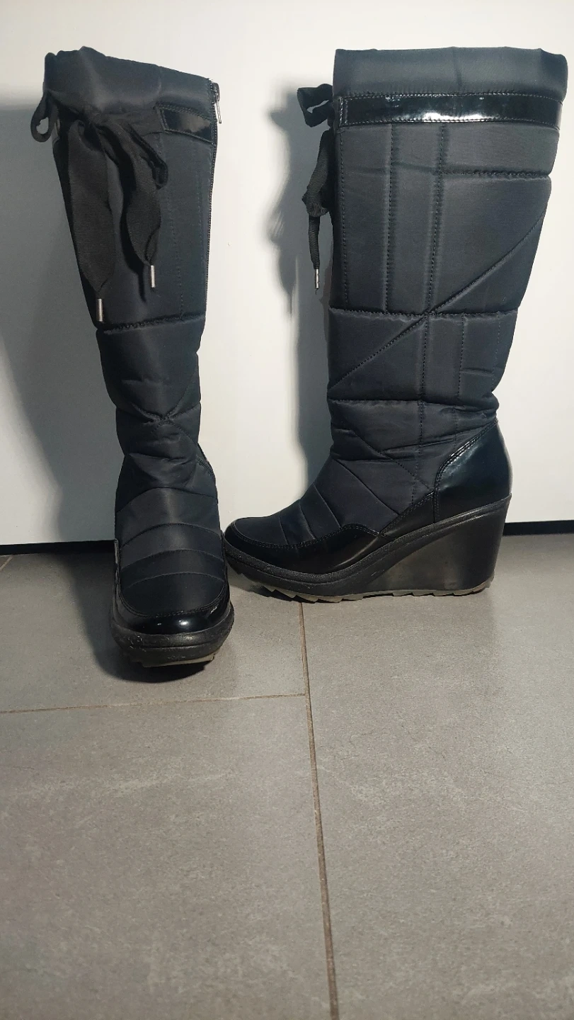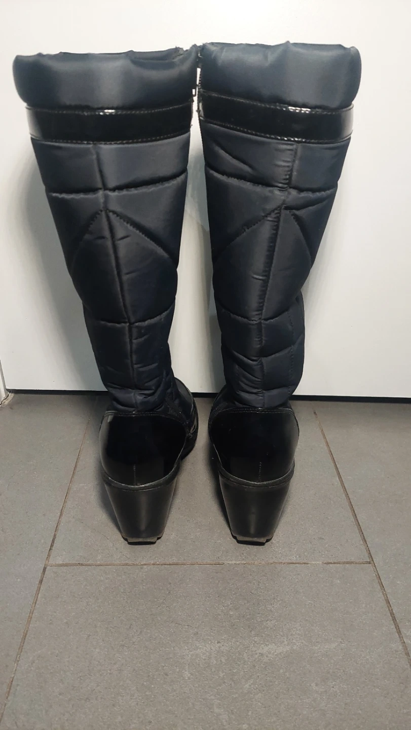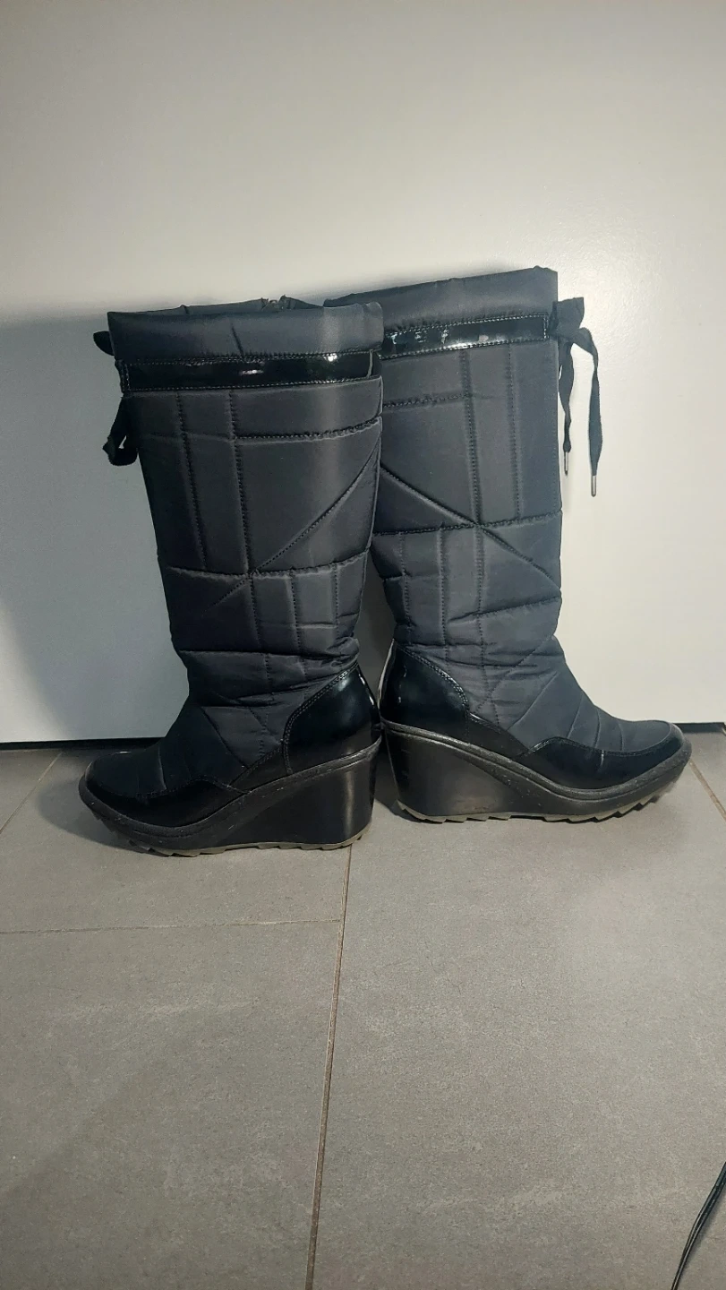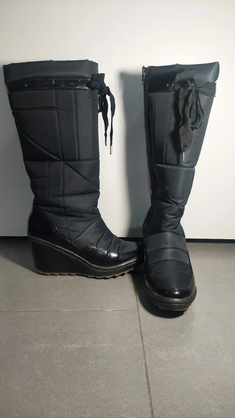 - Selling a pair of black winter boots. They have a quilted design with a bow on the upper part and inner side zipper closure.