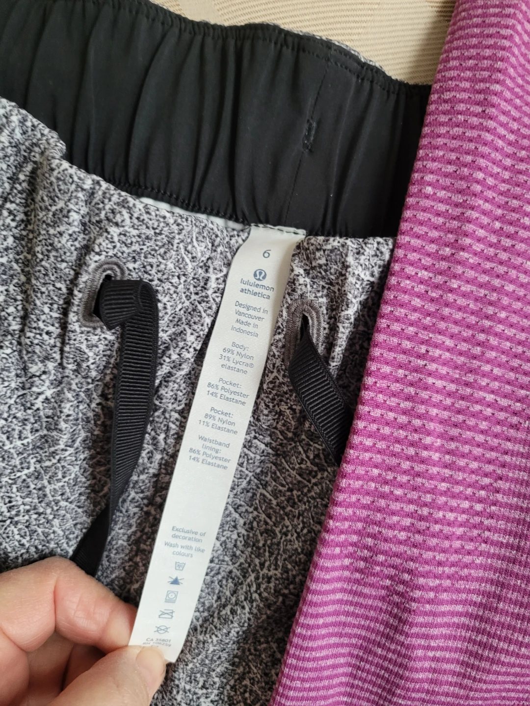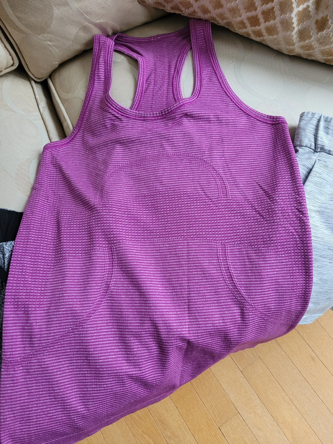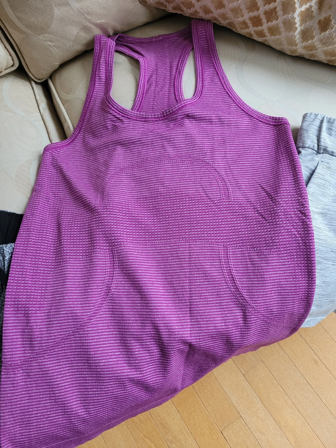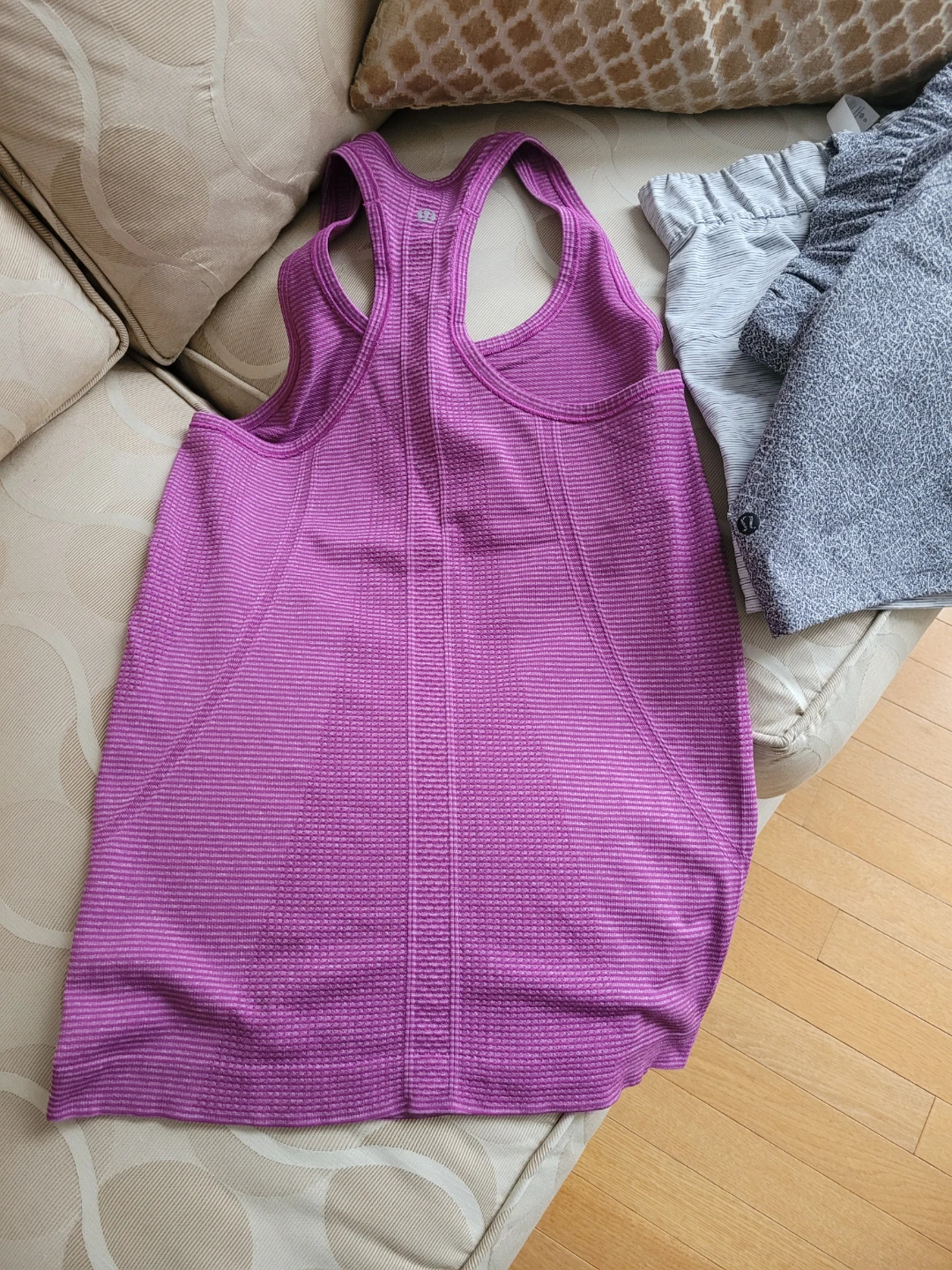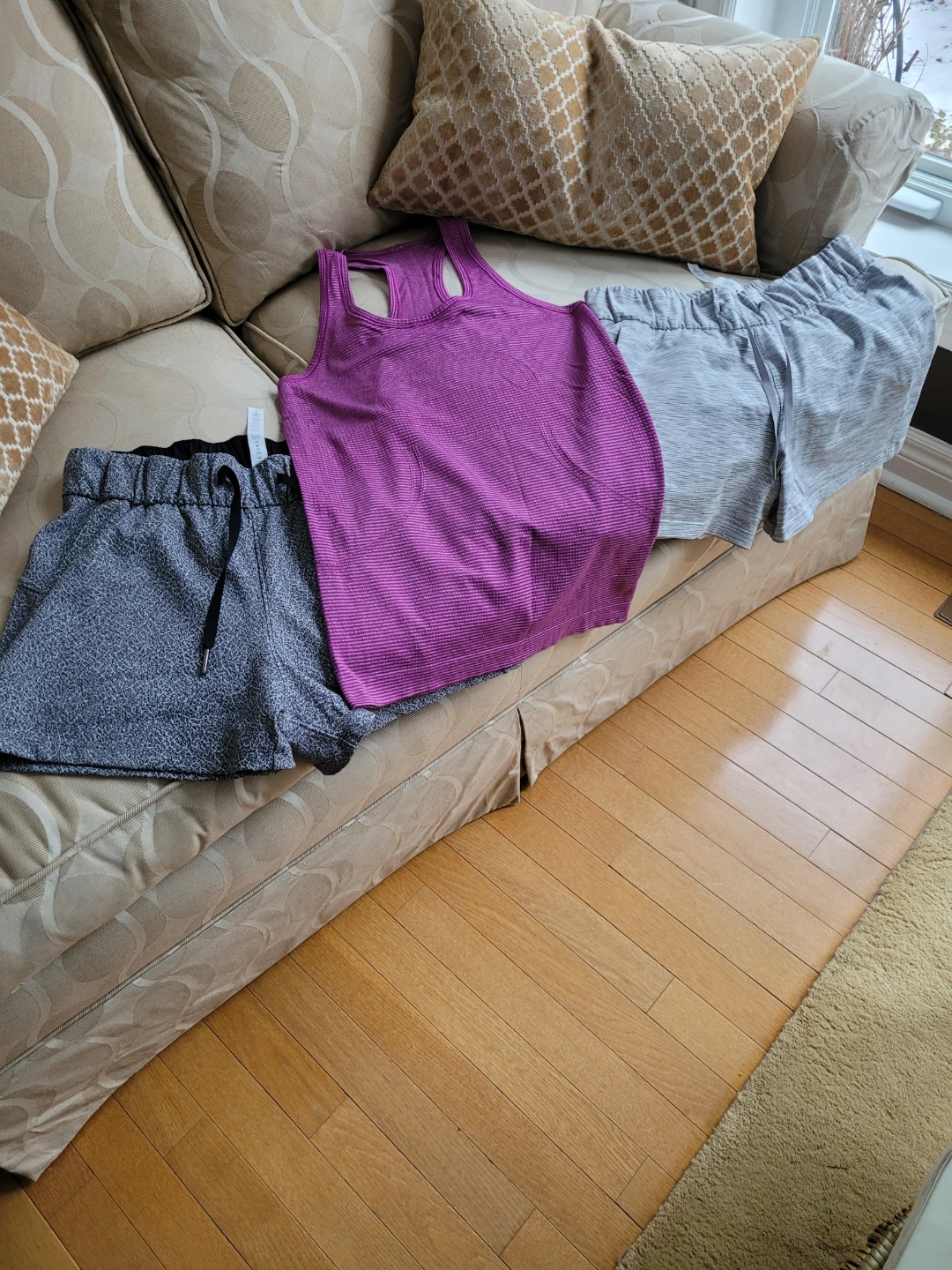 Selling 2 pair of Lululemon shorts in size 6. They're a stylish grey colour and made with comfortable materials: 69% nylon and 31% elastane for the body, 86% polyester and 14% elastane for the pocket and waistband lining. Also the purple racerback workout top Selling as bundle lot of 3 pc's, all gently worn, clean ready to wear. Sorry not selling separately!