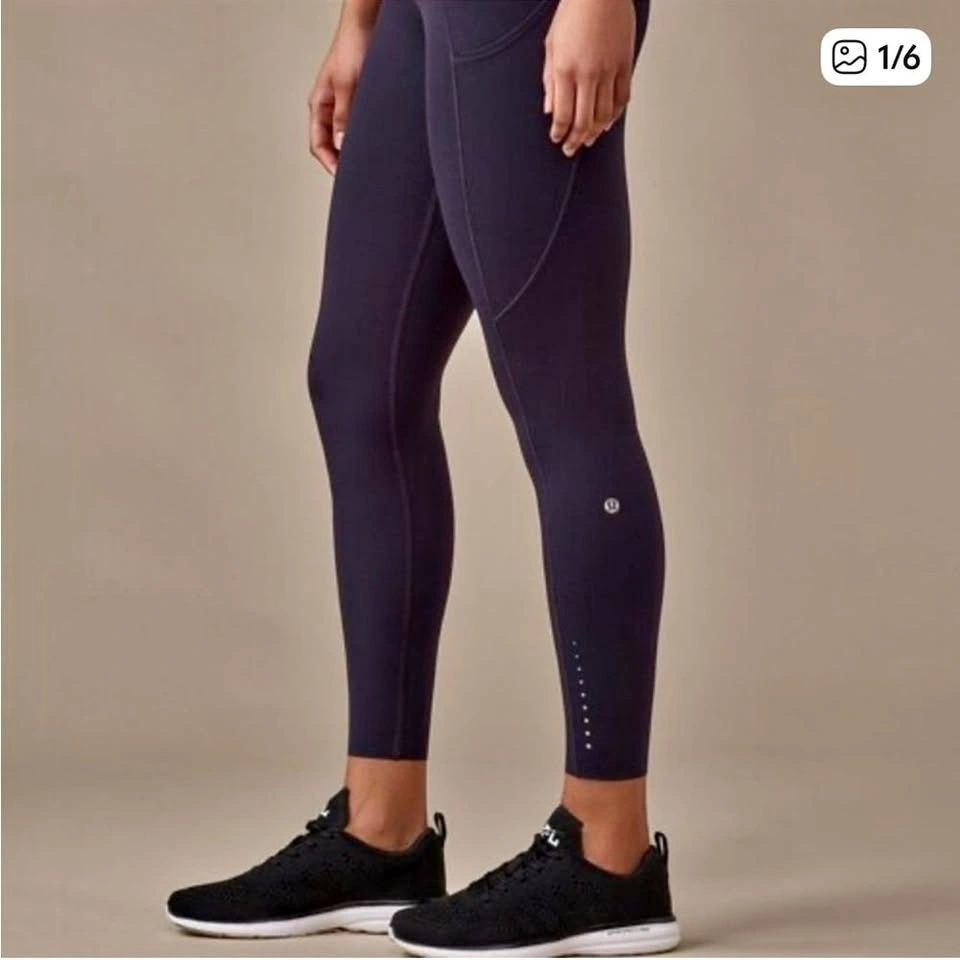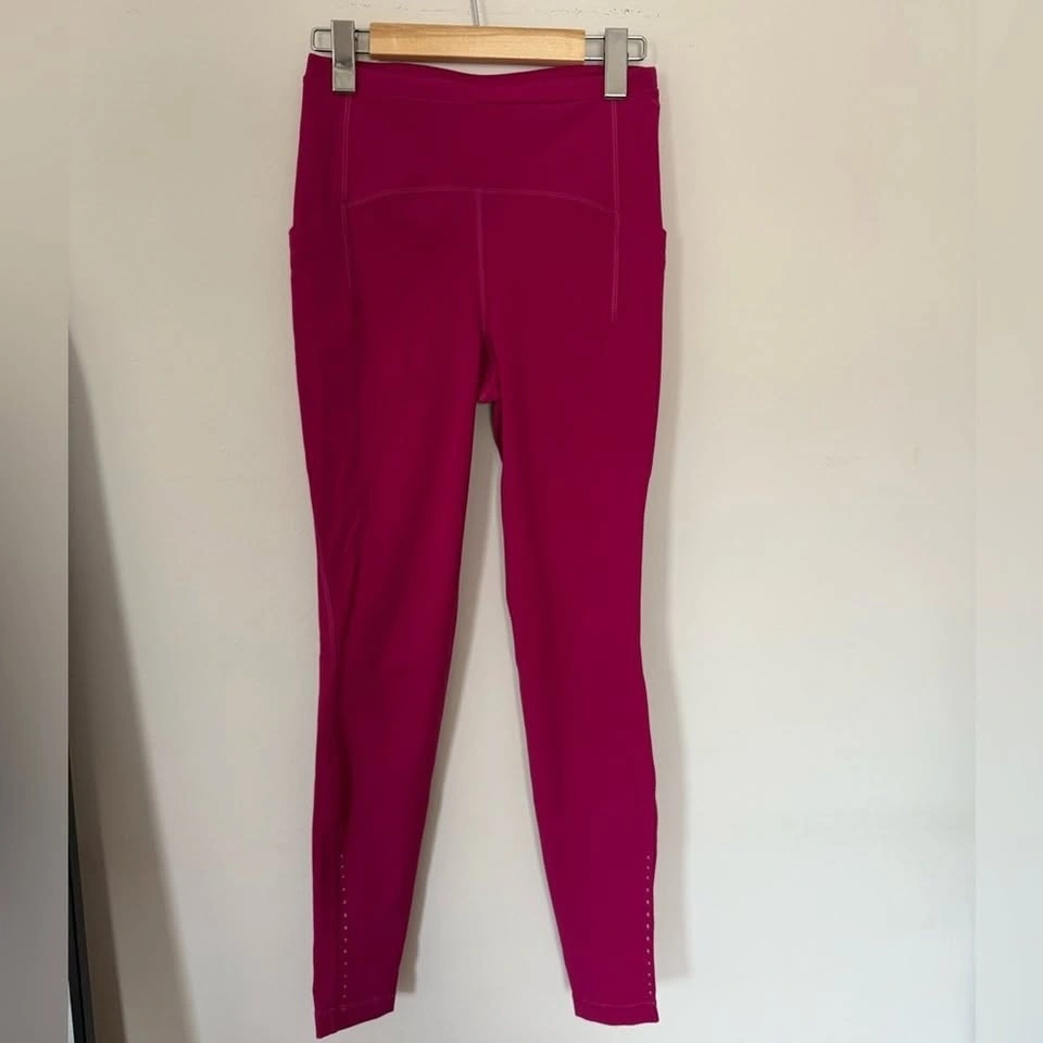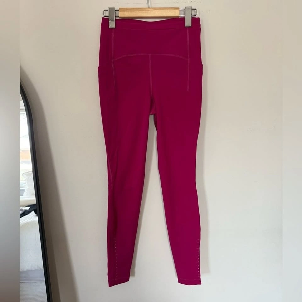 Beautiful magenta Fast & Free leggings featuring Lululemon’s light fabric great for training. Reflective dots along the bottom cuff make these perfect for evening or early-morning runs.