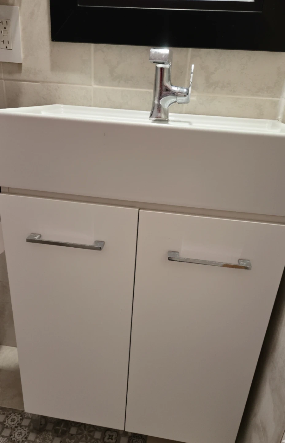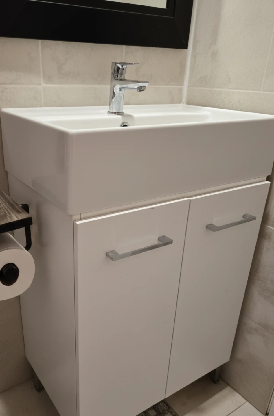 Selling a bathroom vanity in great condition! It's a clean, white colour that would fit well in any bathroom. The vanity has a modern design with sleek, silver handles. Perfect for a small space!
