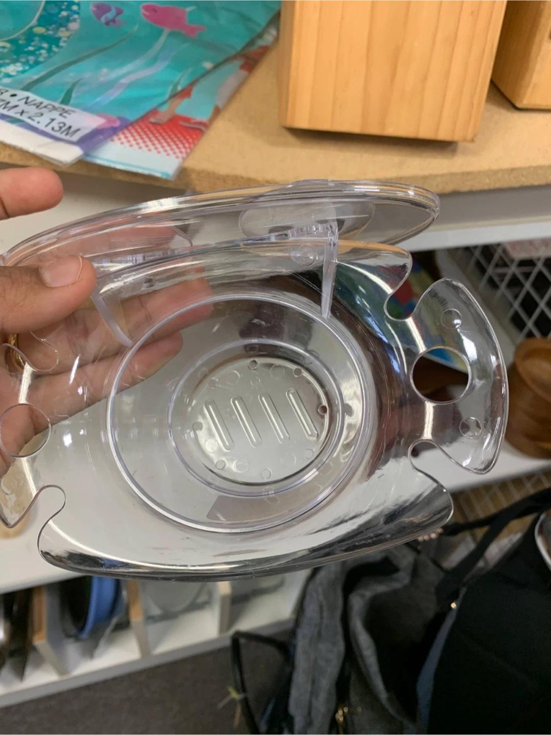 Here's a clear, plastic soap dish shaped like a fish! It has suction cups on the back, so it's easy to attach to your bathroom or kitchen sink