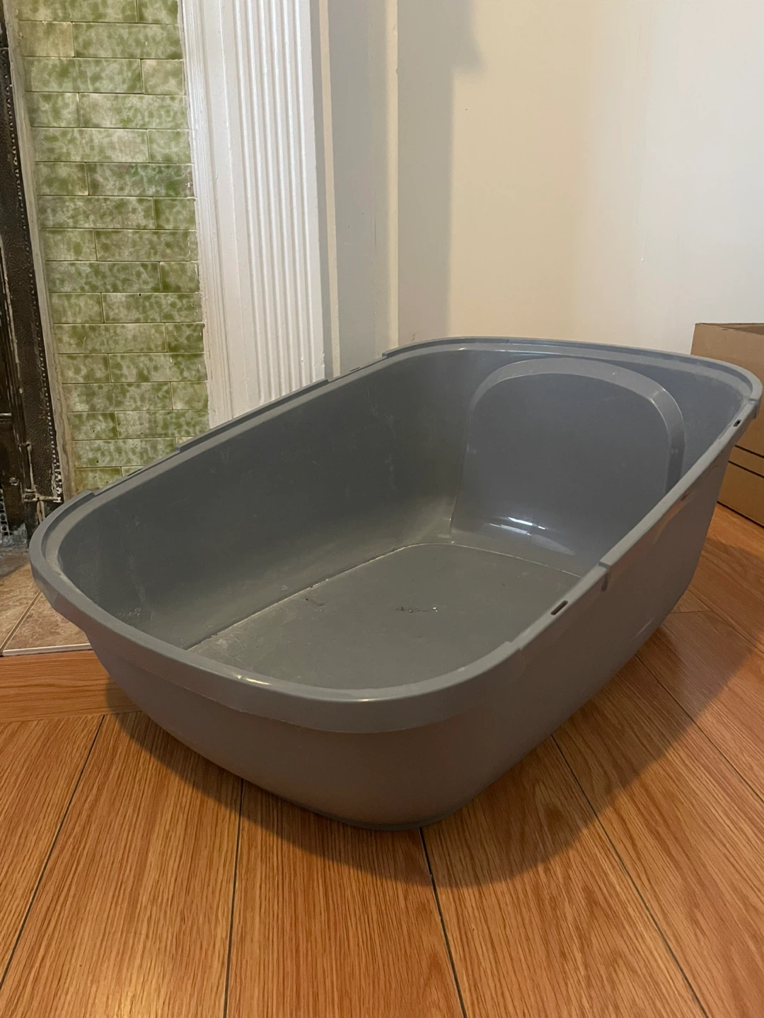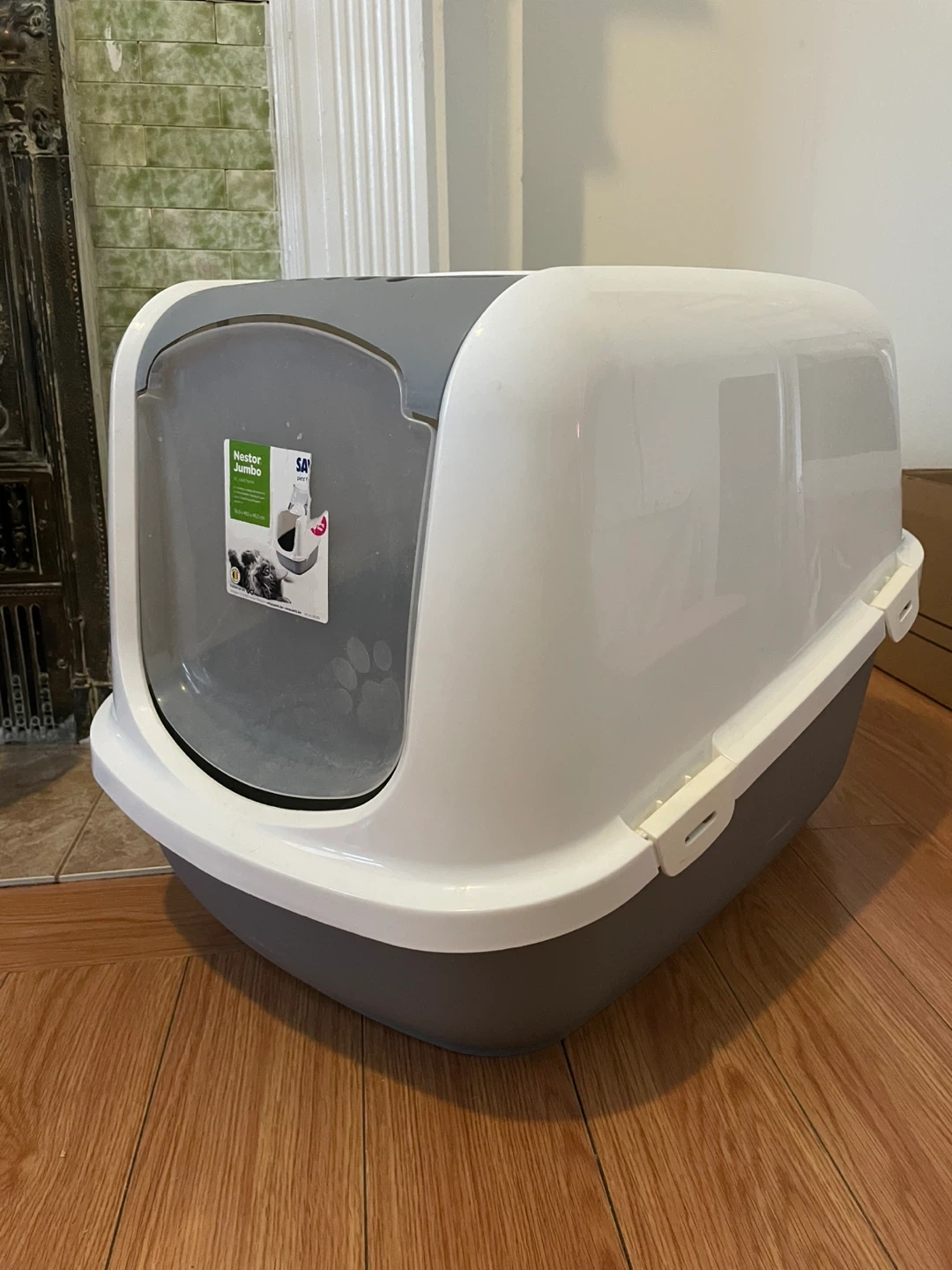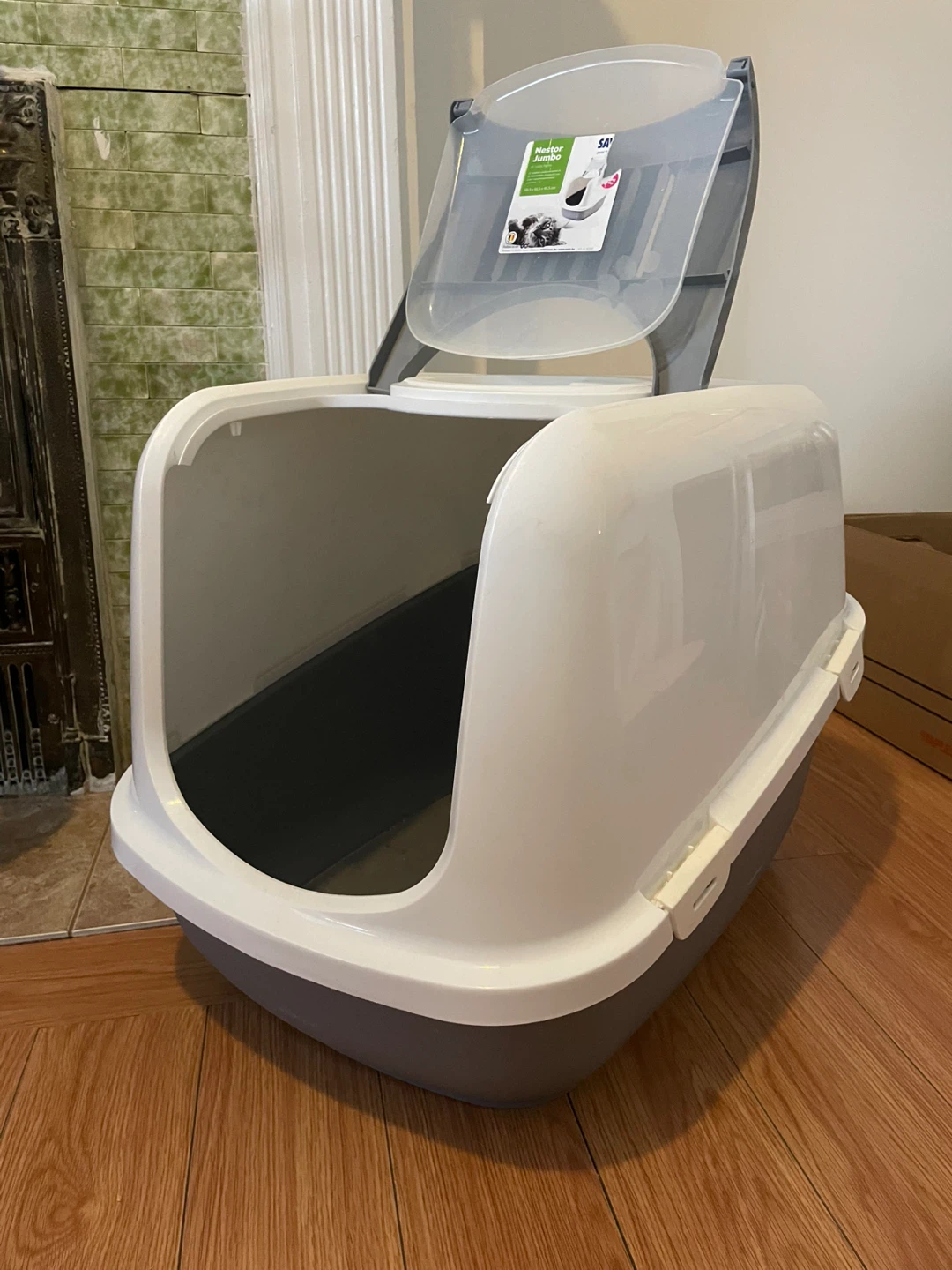 A giant hooded litter box to help contain any mess. The clear flap is removable if your cat prefers an open entrance. The entire front can be flipped up for easy cleaning, or remove the lid completely!