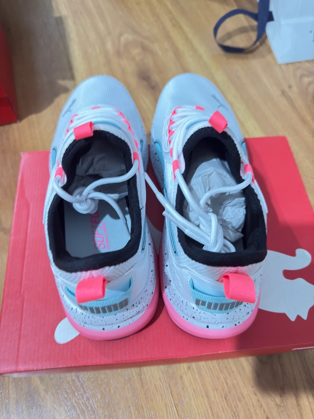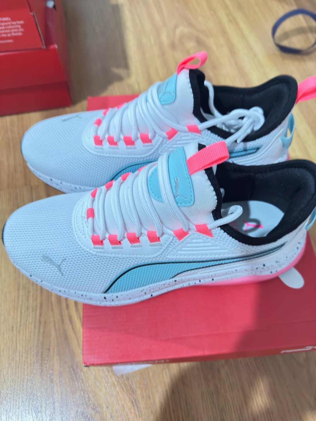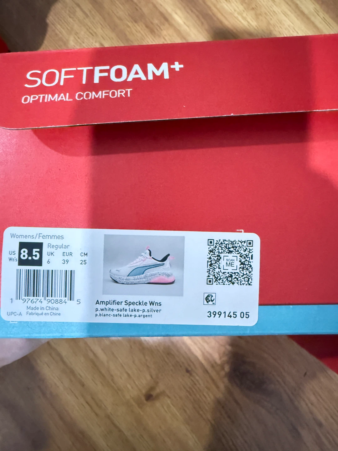 Selling a pair of Puma Amplifier Speckle Wns sneakers in women's size 8.5! These shoes feature SOFTFOAM+ for optimal comfort. The color is p.white-safe lake-p.silver. They come with the original box!