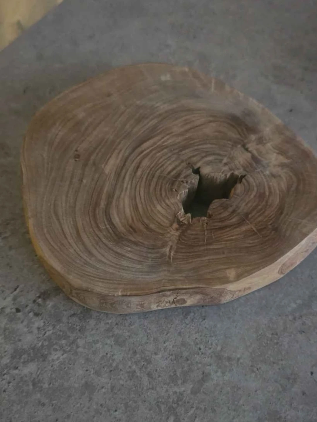 Selling a rustic wooden olive tree slice, perfect for adding a natural touch to your home decor! It has unique wood grain patterns and a charming, organic shape. It could be used as a decorative piece or a small serving board