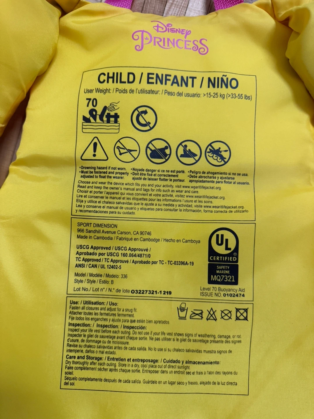 Keep your little one safe and stylish with this Disney Princess child's life jacket! It's a size 70, suitable for kids weighing 15-25 kg (33-55 lbs). Features a fun design with favourite Disney princesses.