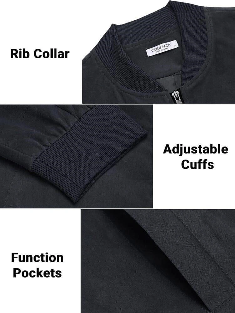 Looking to sell a COOFANDY men's bomber jacket in black! It features a rib collar and adjustable cuffs. Also has function pockets. size XXL and comes in its original packaging!