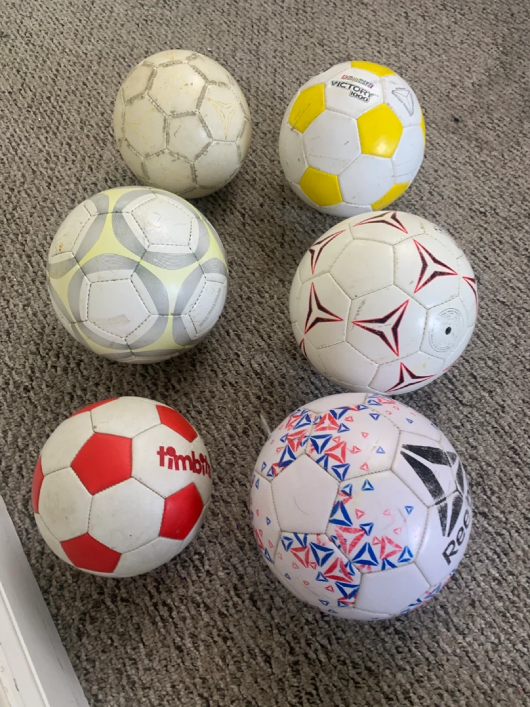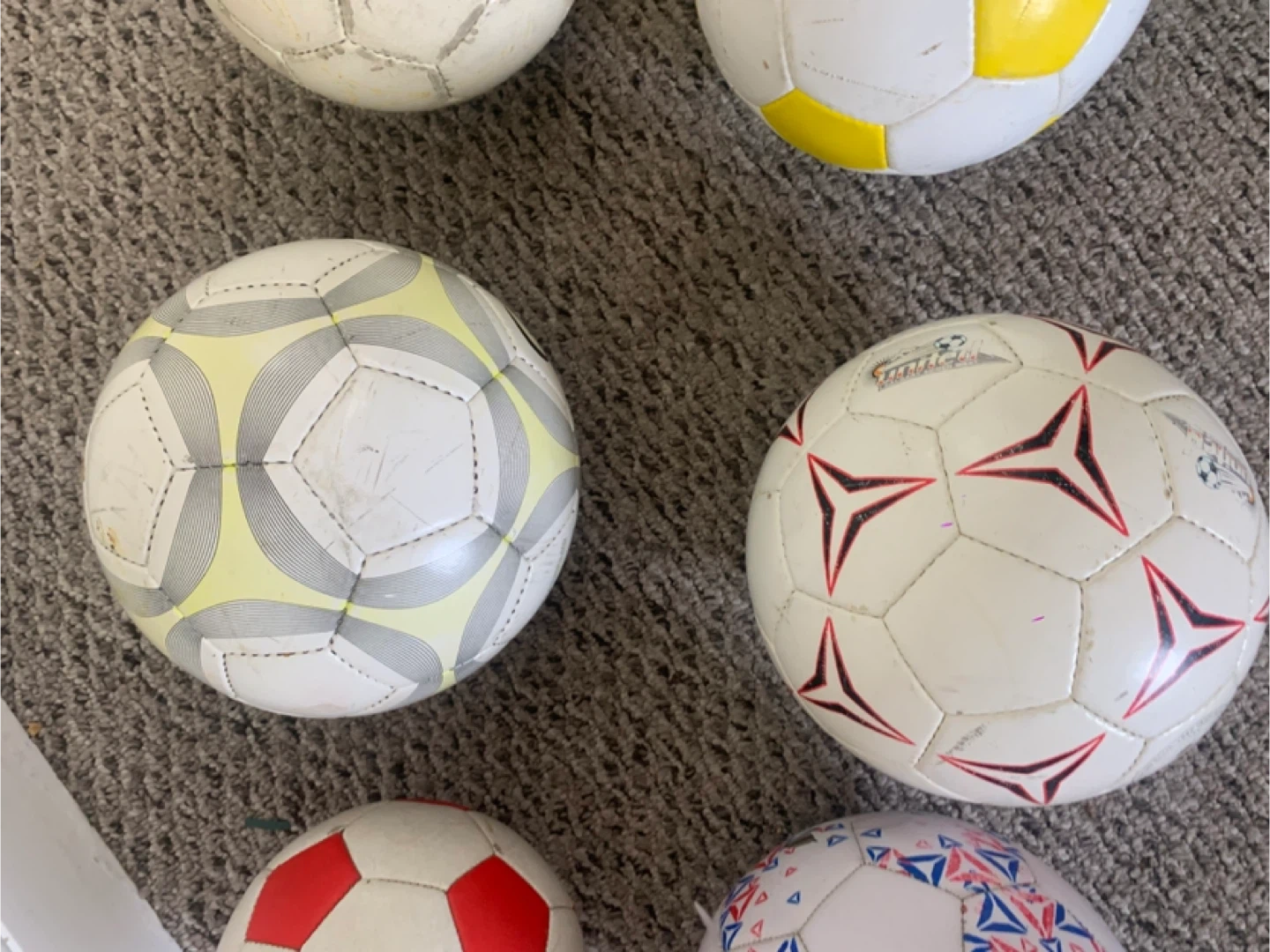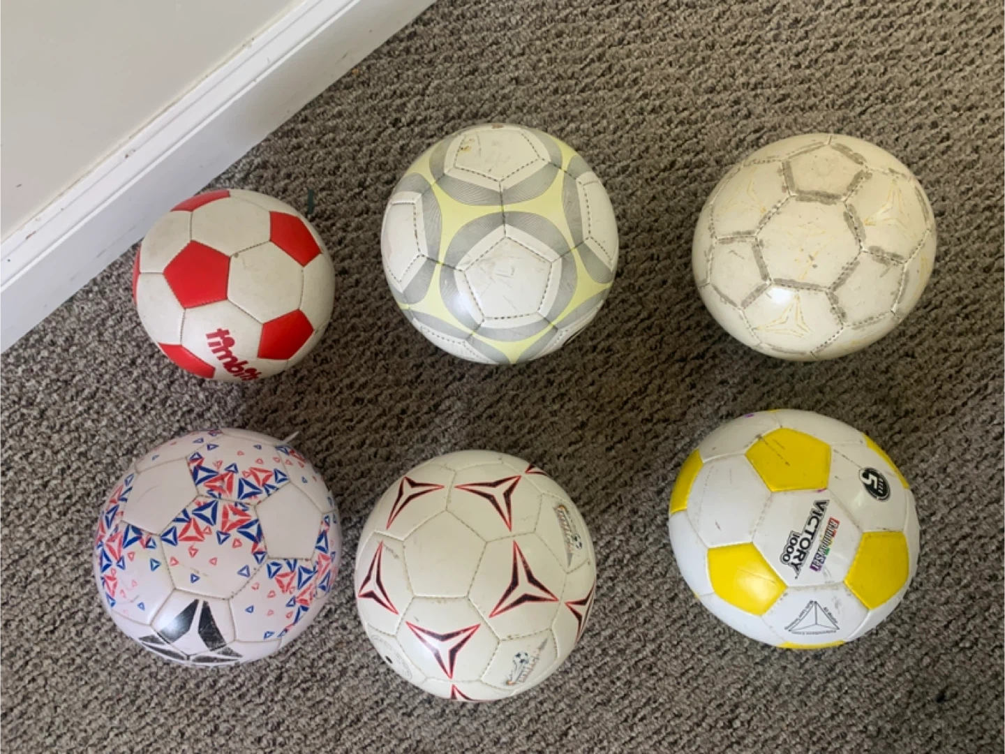 Selling a set of six used soccer balls. They're perfect for casual play or practice. All are in fair condition with some signs of wear and tear, but still have plenty of life left!