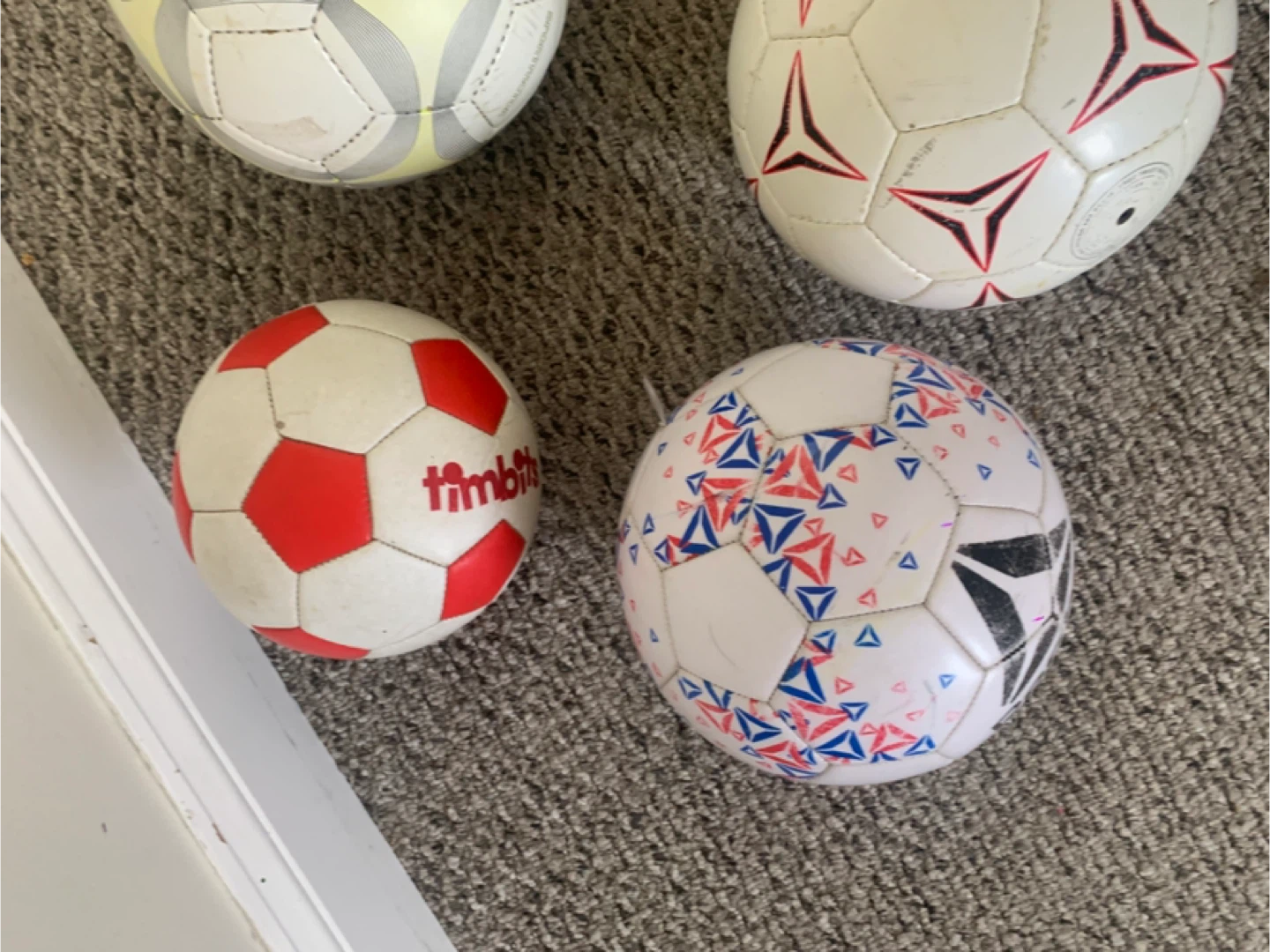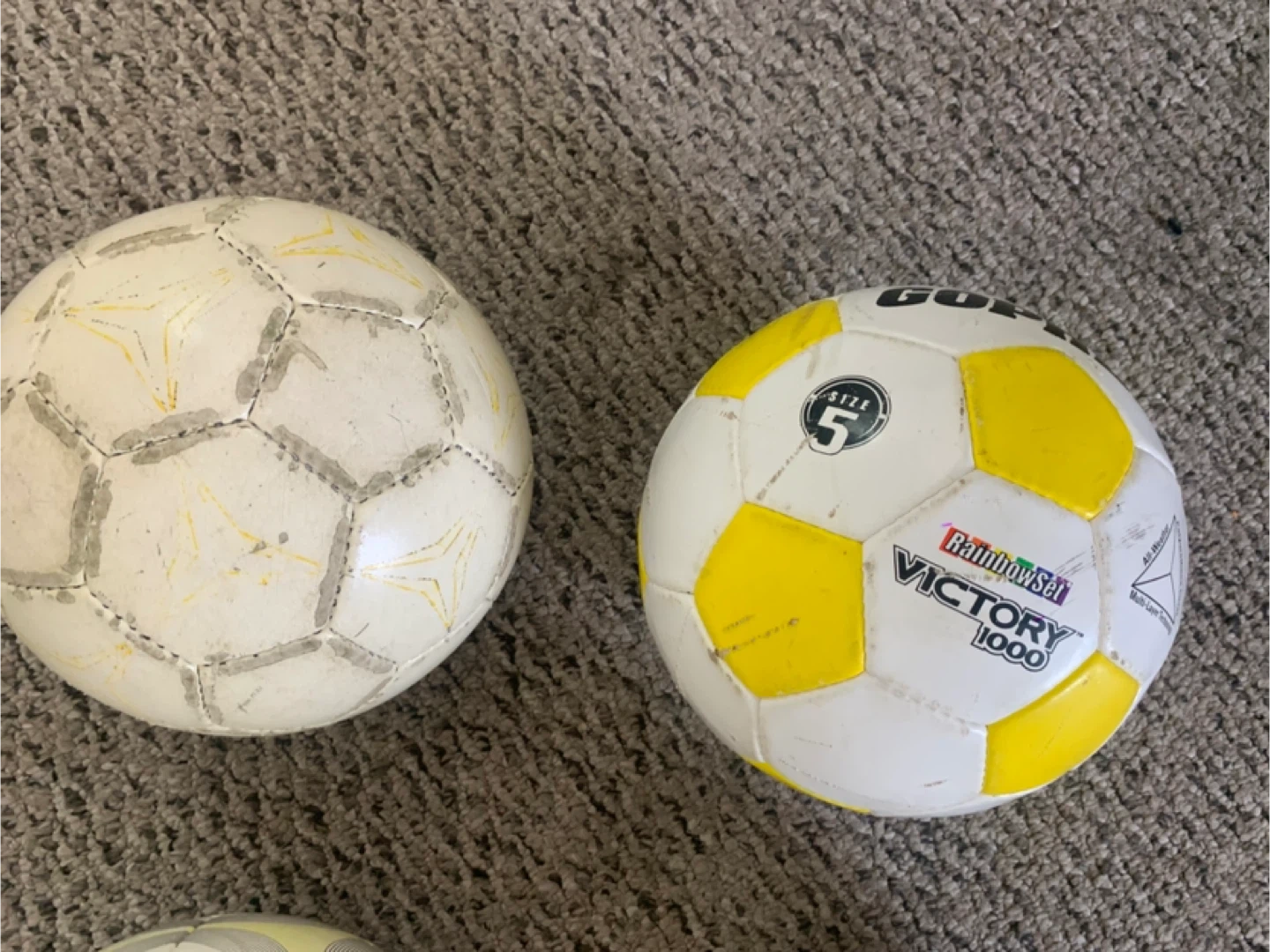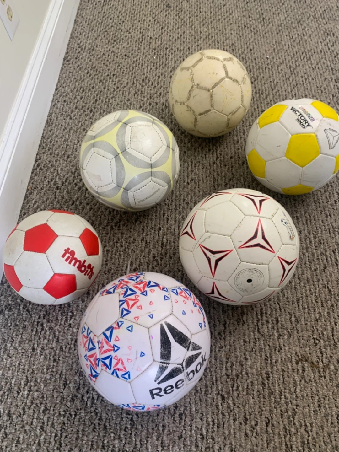 Selling a set of six used soccer balls. They're perfect for casual play or practice. All are in fair condition with some signs of wear and tear, but still have plenty of life left!