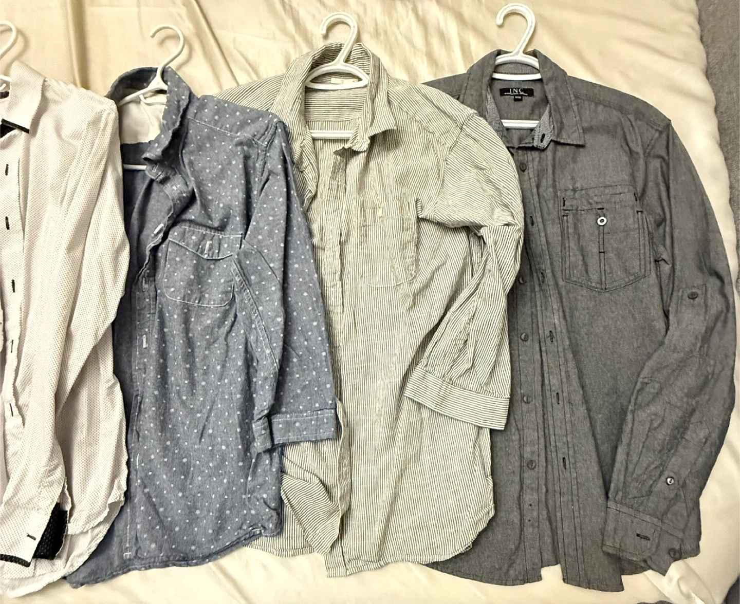 Selling a lot of six men's dress shirts. There are various brands and patterns, including Zara and LSC. All are in good used condition and ready for a new wardrobe