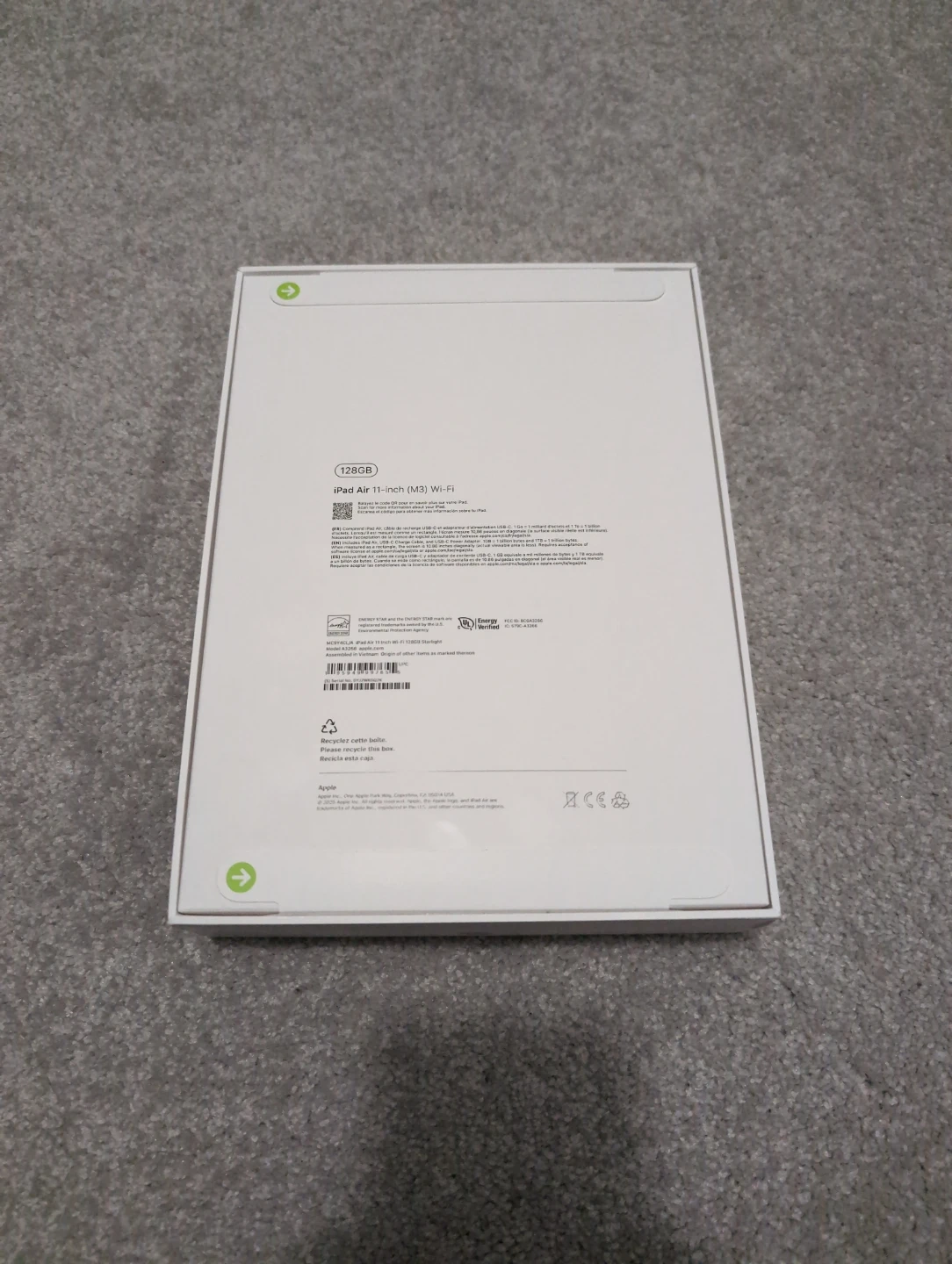 Selling an Apple iPad Air 11-inch with the M3 chip and 128GB of storage. It's the Wi-Fi model New and Seal packed, comes with the original box and full apple warranty. Perfect for browsing, streaming, or getting work done on the go!