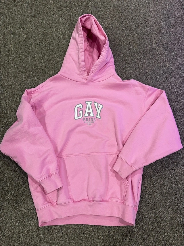 Get ready to turn heads with this eye-catching Balenciaga hoodie in a vibrant pink, size XS! This gently worn hoodie is in good condition, perfect for adding a pop of colour and high-fashion flair to your wardrobe. The stylish "Gay Pride" logo adds a unique touch, making it a standout piece. Here are the details: