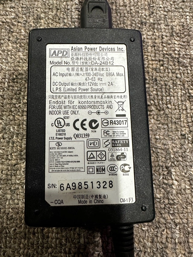 I'm selling a used Asian Power Devices Inc. power adapter, model number DA-24B12. It outputs 12Vdc at 2A and accepts AC input from 100-240Vac at 47-63Hz. This adapter is perfect as a replacement or spare. It’s a bit of a treasure, this adapter, ready to power your devices back to life! If the ad is up, it’s still available and ready to go!
