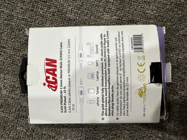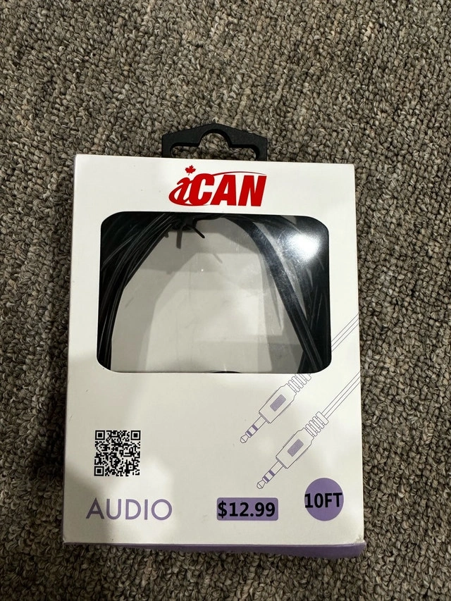 Enhance your audio experience with this brand new iCAN PREMIUM 3.5mm stereo male to male cable, 10 feet long, featuring gold-plated connectors for premium sound transmission from your PC, DVD, or MP3 player to speakers or amplifiers equipped with 3.5mm jacks. Specifications: * Cable Type: 3.5mm Stereo Audio * Length: 10 ft * Connectors: Gold Plated * Shielding: Fully shielded * Gauge: 22AWG This audio cable is so new, it's practically still in its packaging! If the ad is up, it's available!
