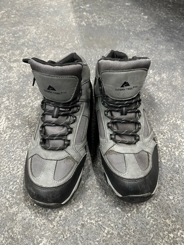 Grab these Ozark Trail waterproof hiking boots, perfect for hitting the trails! These used, grey, size 12 boots are in good condition and ready for adventure. They feature a durable outsole for great traction on any terrain.