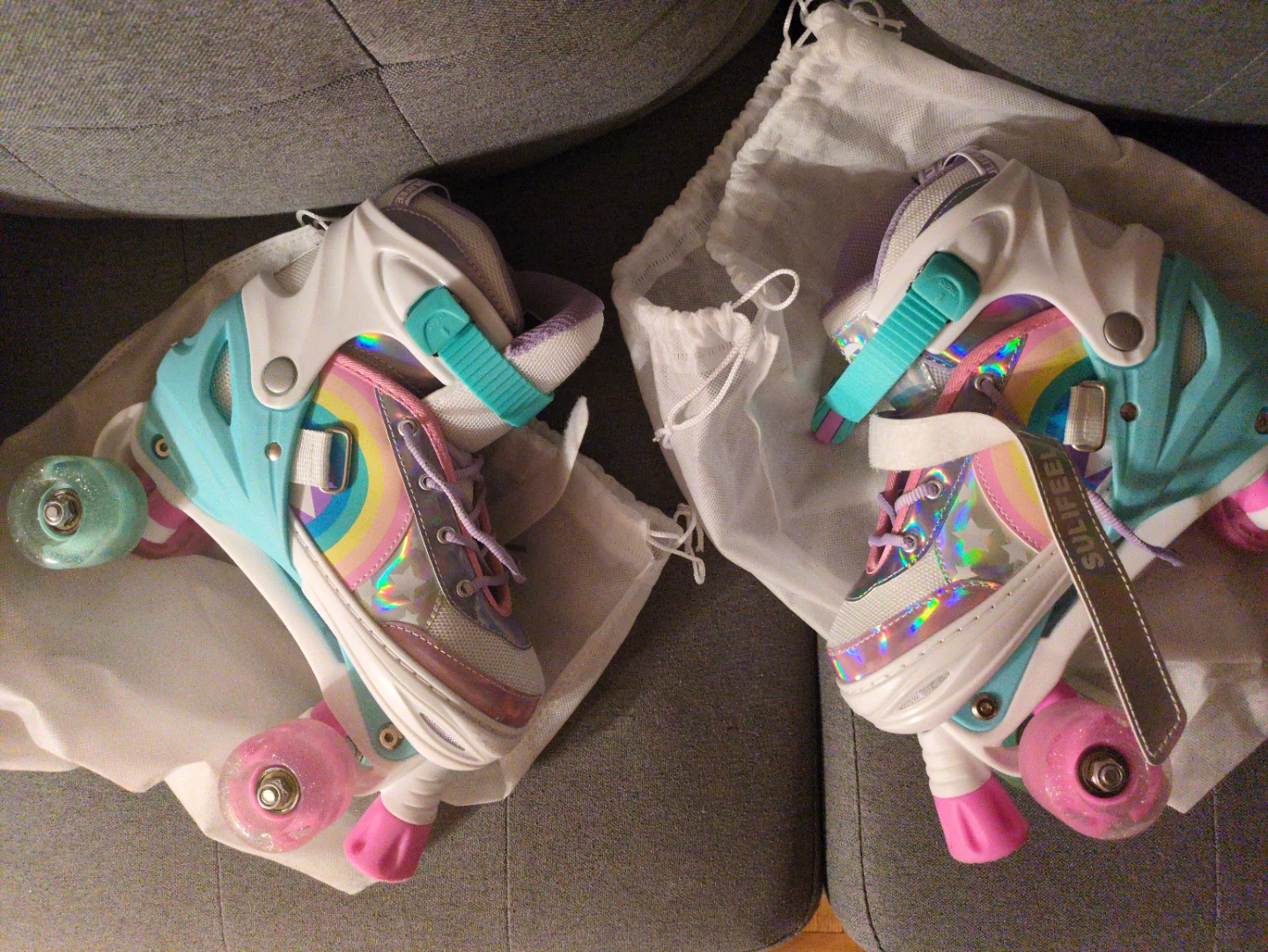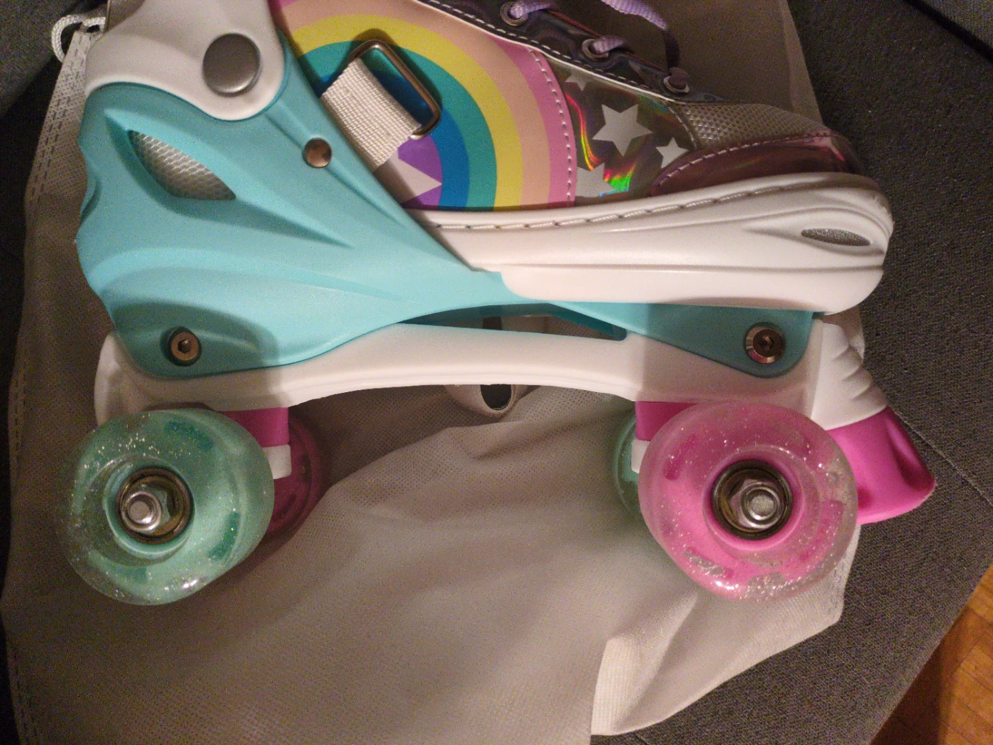 Cute SuliFeel roller skates with a fun unicorn design - size 4! These are in great condition and ready for some fun skating adventures. The wheels are a mix of pink and turquoise. Comes with a carrying bag!