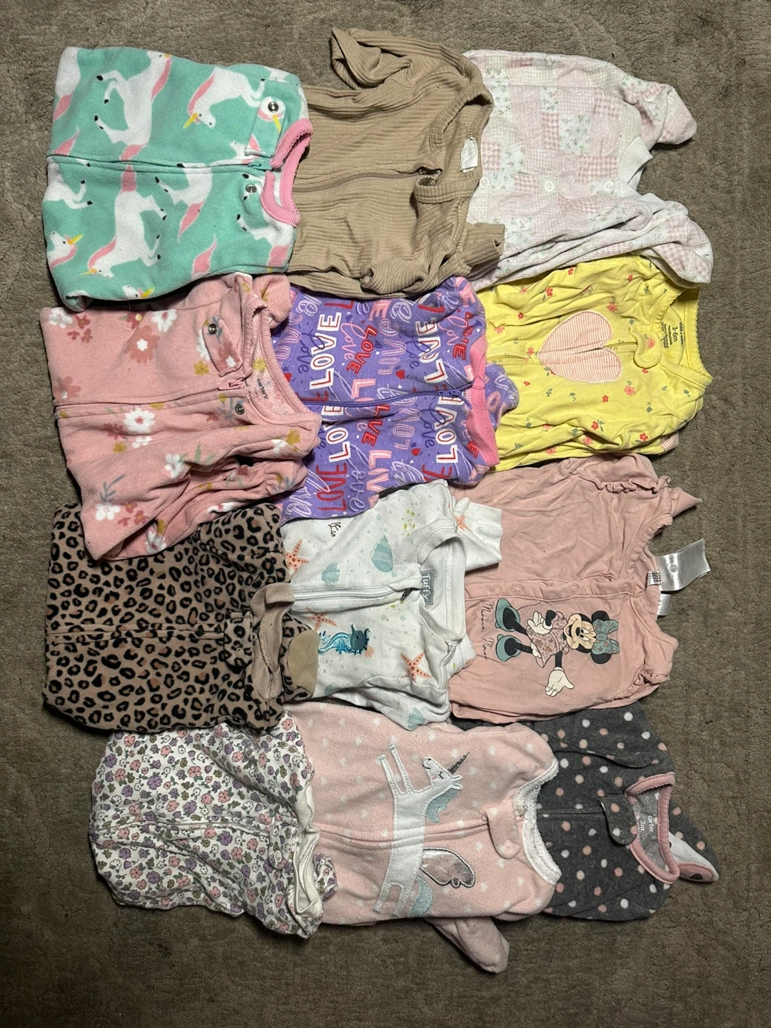 Selling a bundle of baby sleepers in various colours and patterns! There are multiple brands included, such as Carter's and Tuff. Great for keeping your little one cozy and comfy during sleep time 3 months