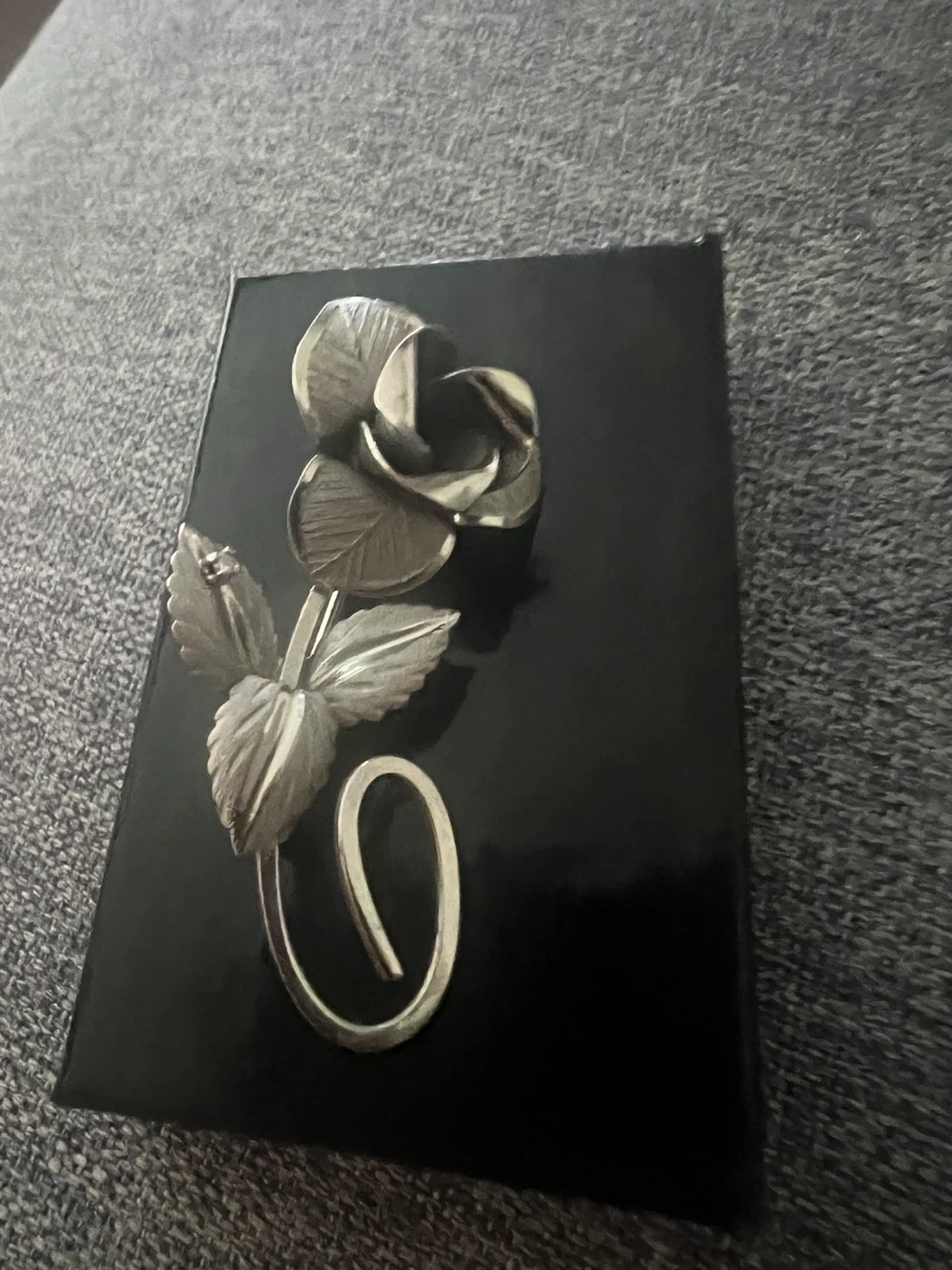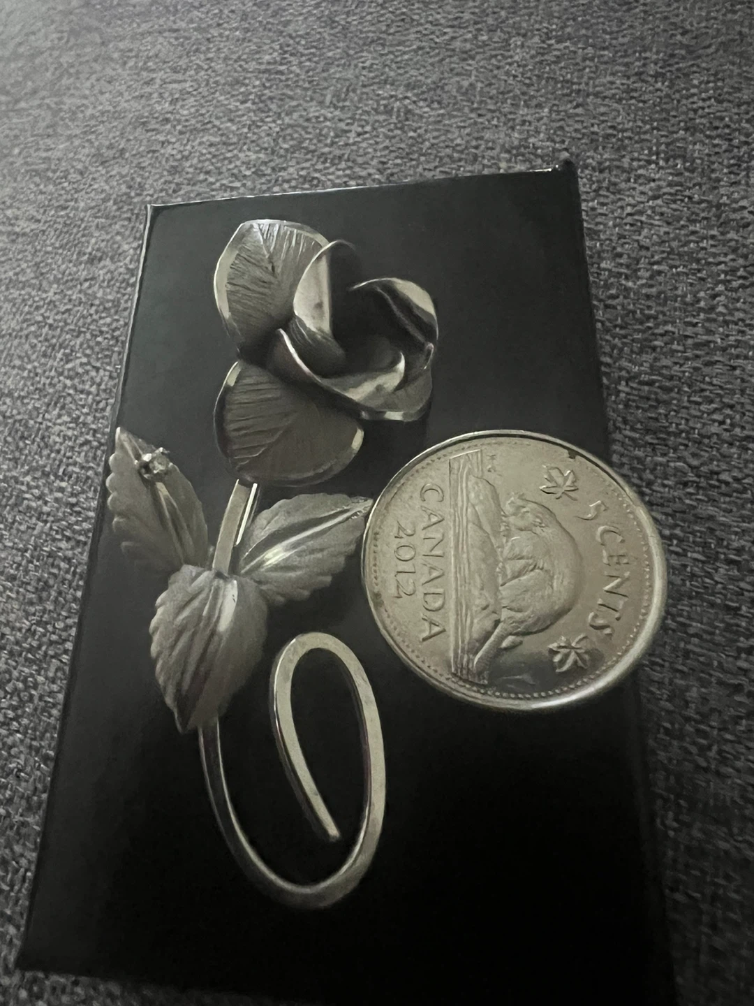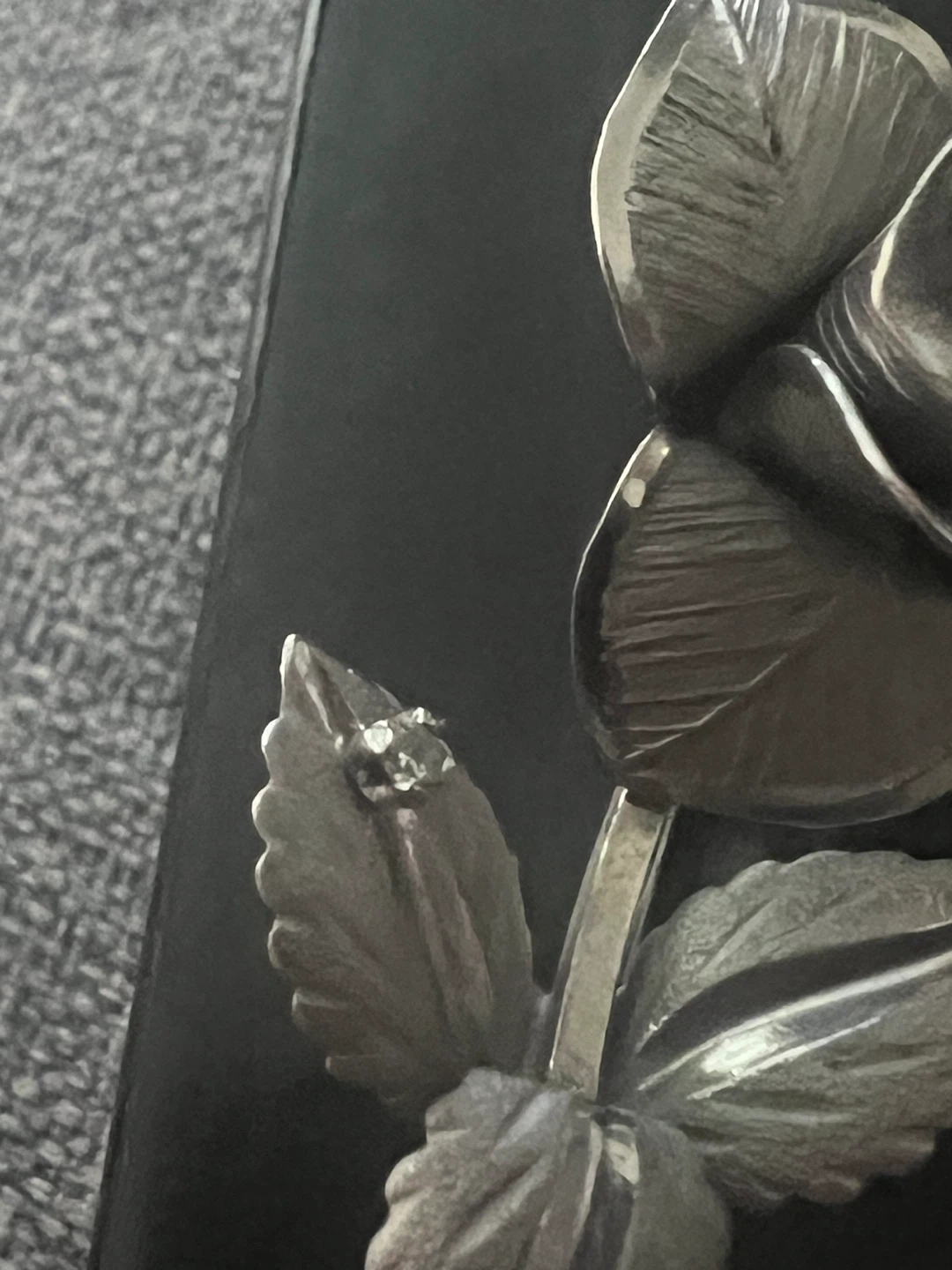 925 silver rose brooch with 1 diamond . It's a beautiful piece and would make a great addition to any collection. The brooch is in good condition for its age, with some minor signs of wear. Stamped 'Sterling' on the back.