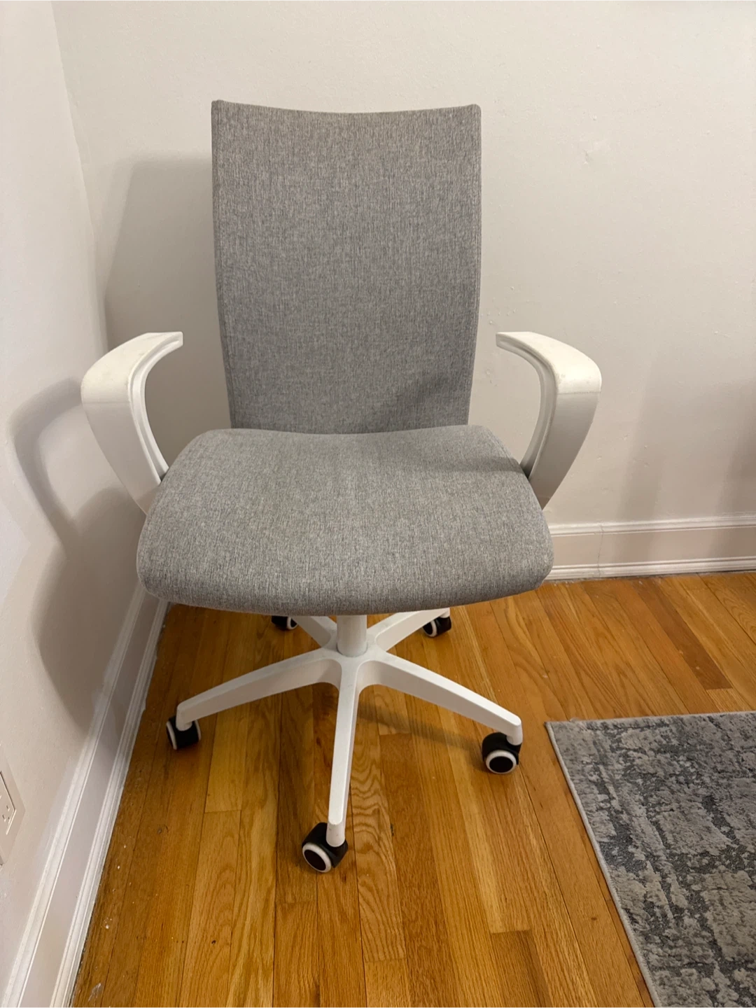 Selling a comfortable gray office chair. It features a white base and armrests. Great for your home office or study space!