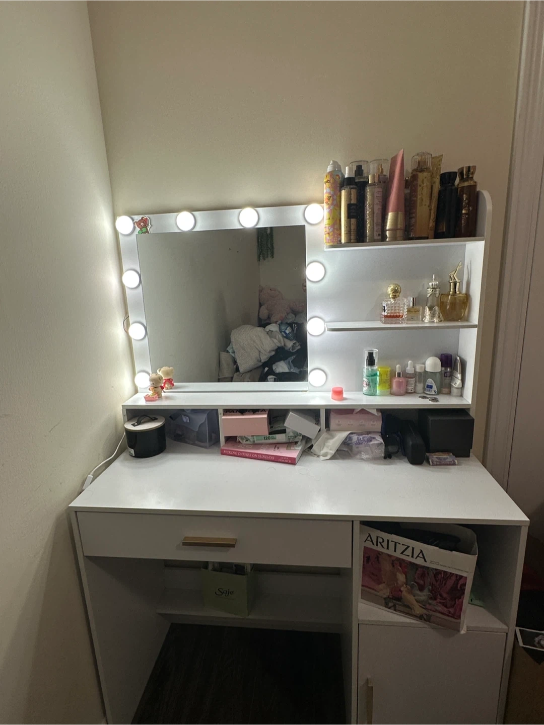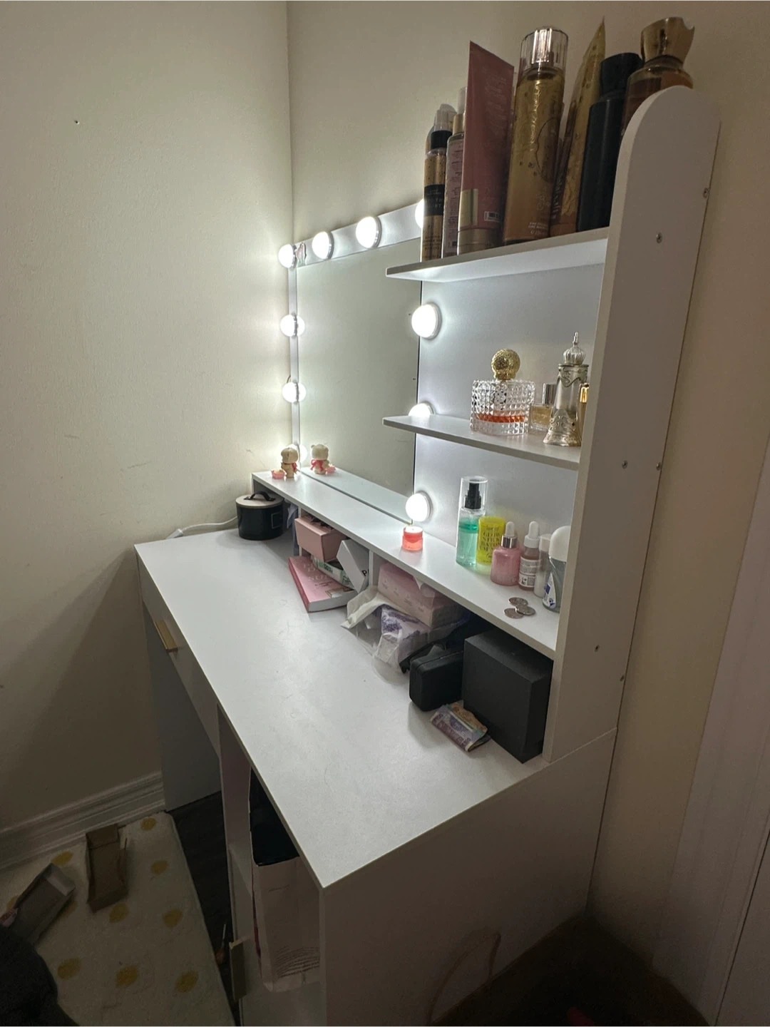 ✔ Bright LED light bulbs around mirror (perfect for makeup)