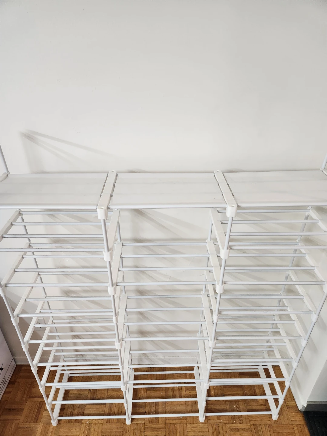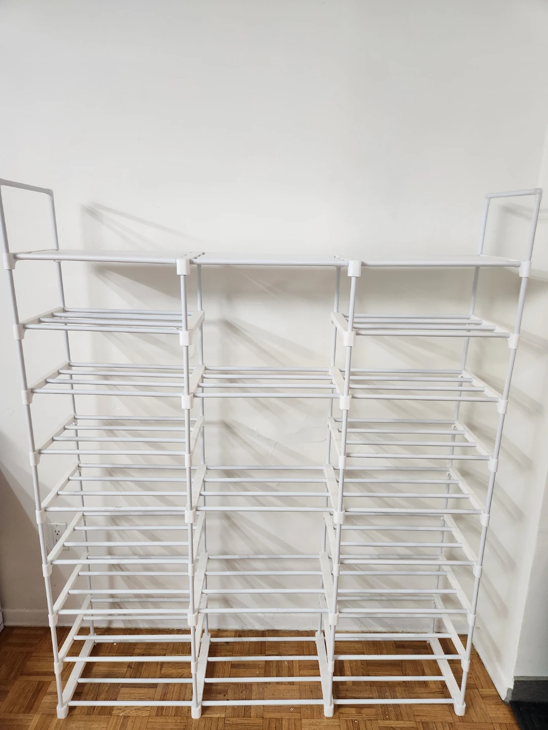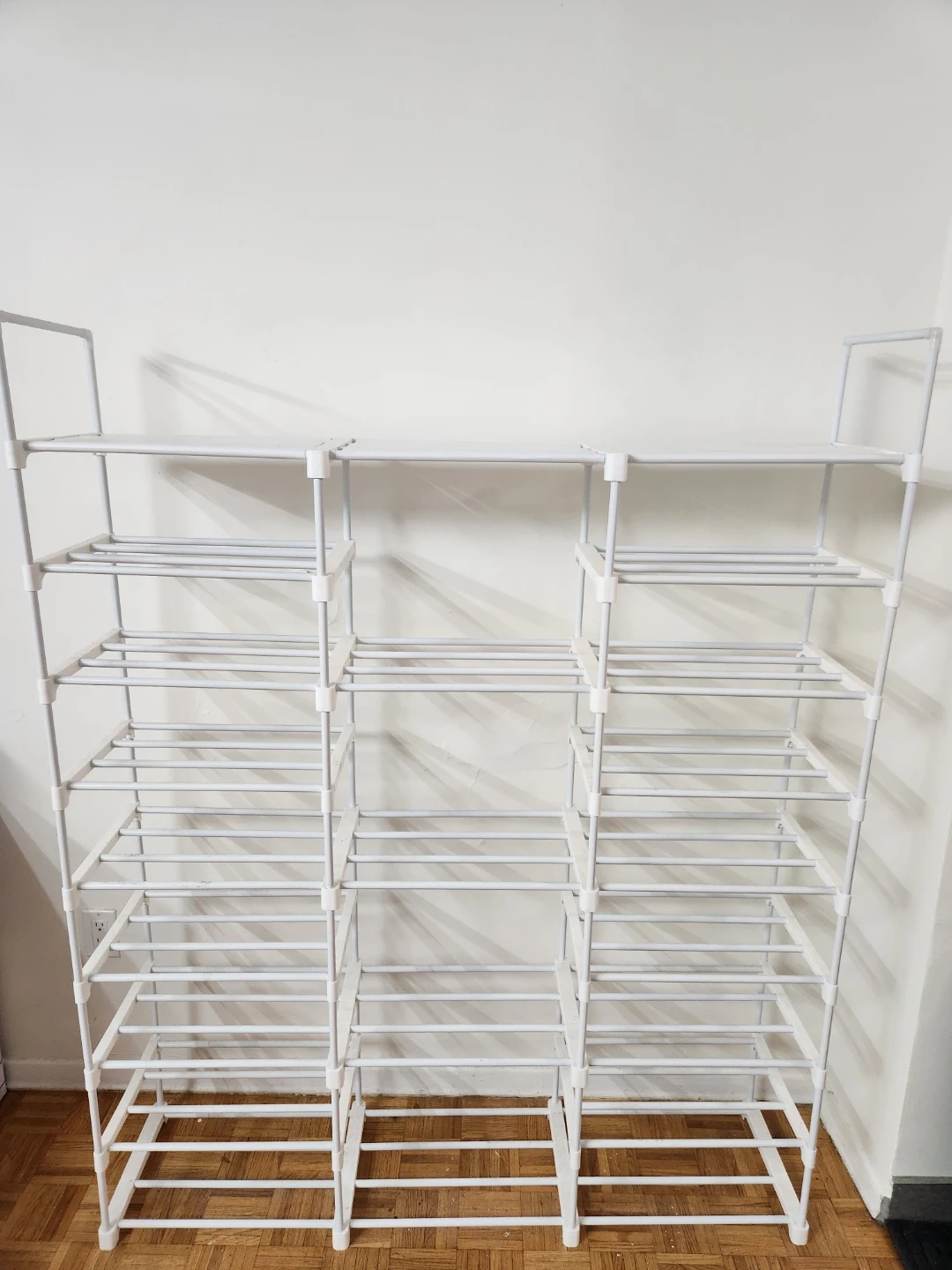 Selling a white metal shoe rack in great condition! It's perfect for organizing your shoes and keeping your entryway tidy. It has multiple tiers to hold a lot of shoes. It's also lightweight and easy to move around if needed