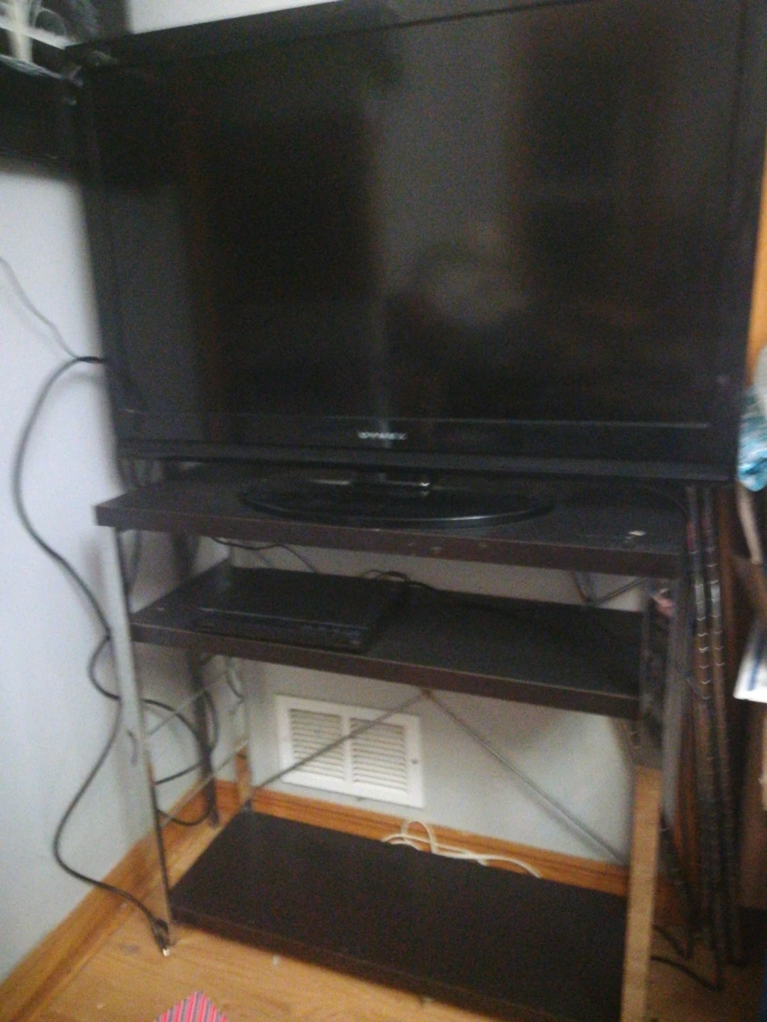 Selling a Dynex TV with a stand. The stand is dark brown with chrome legs and has 2 shelves. Also included is a Sony DVD player.
