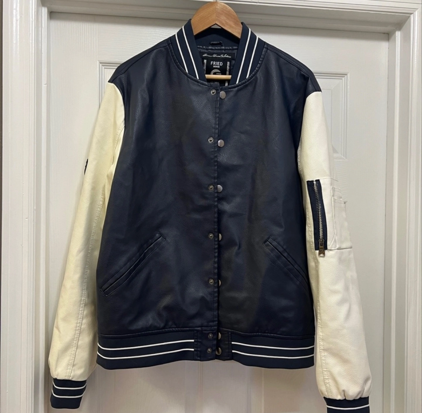 Selling a FRIED Denim varsity jacket in navy and cream. It's in great condition and has a classic look. Perfect for adding a stylish touch to your wardrobe!