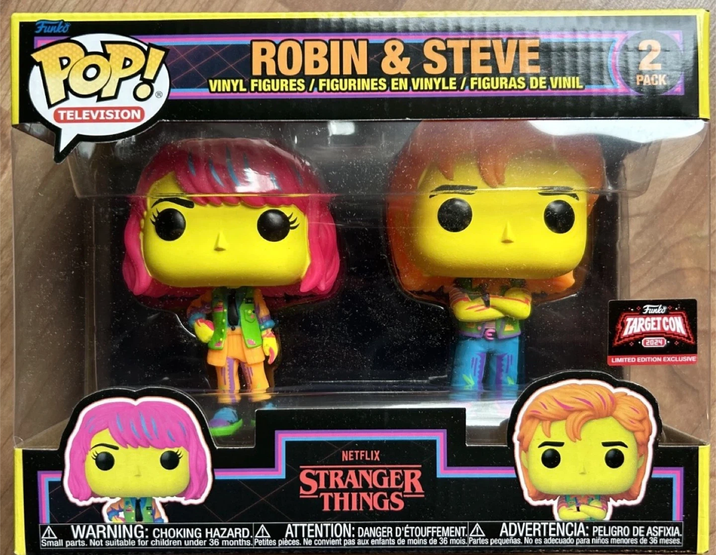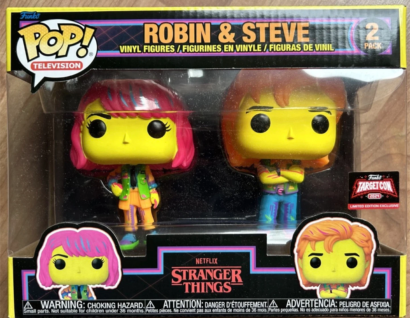 Selling a Funko Pop! Television 2-pack featuring Robin & Steve from Stranger Things. These vinyl figures are still in their original packaging and it's a Target Con 2024 Limited Edition Exclusive!