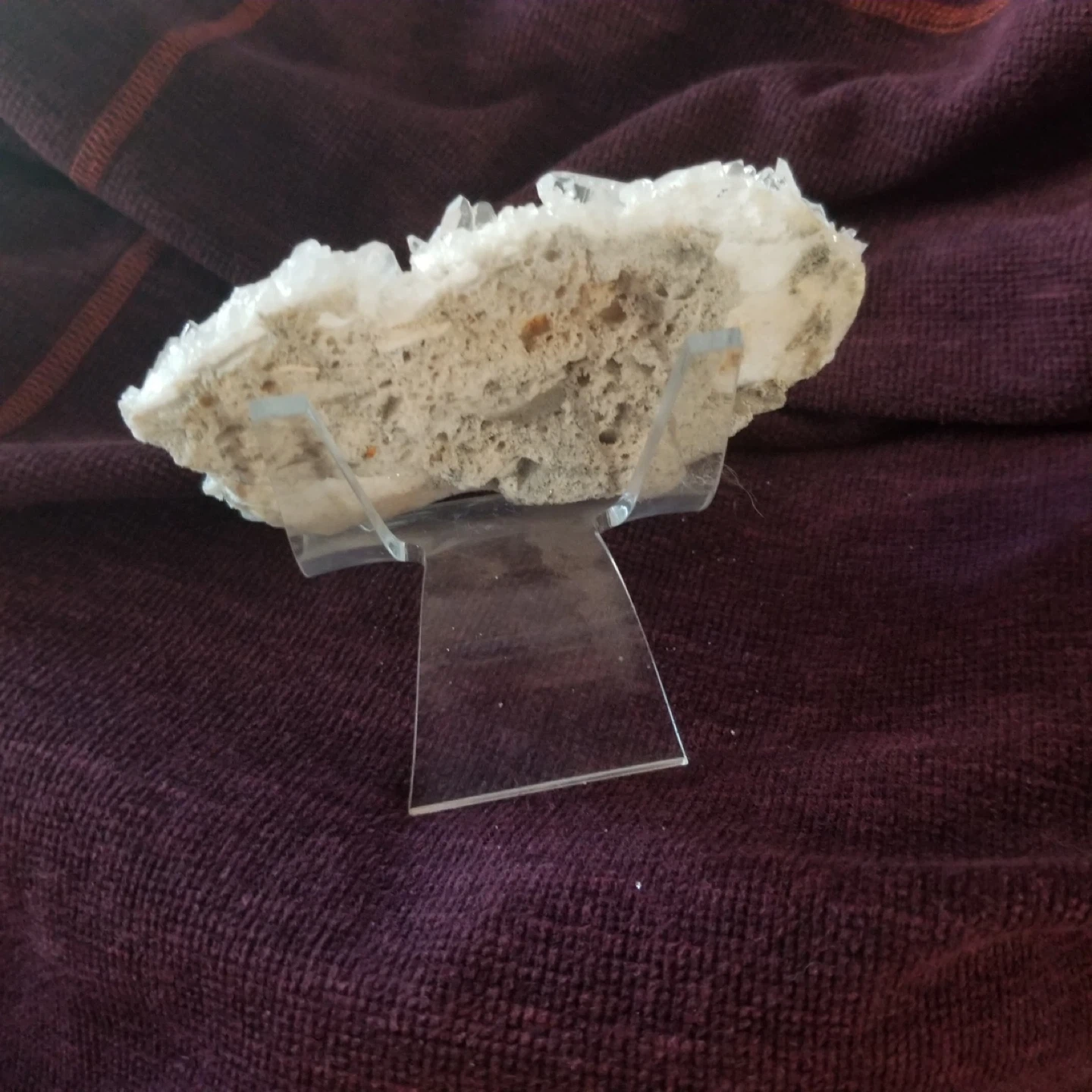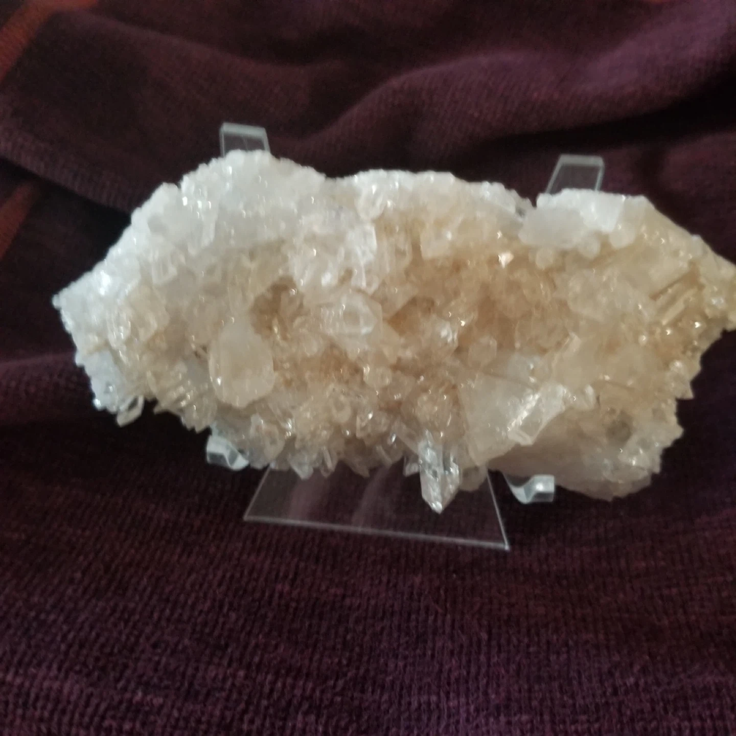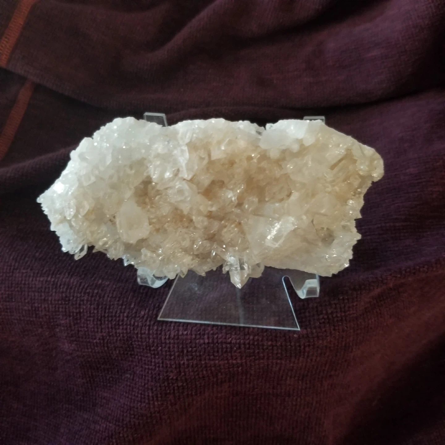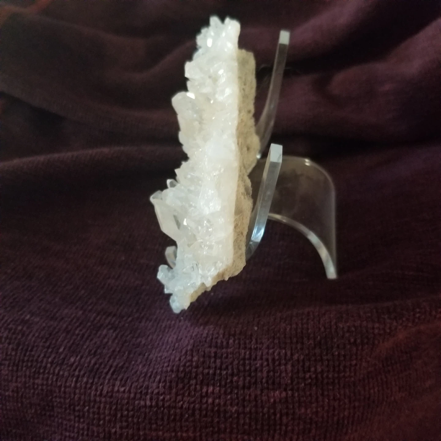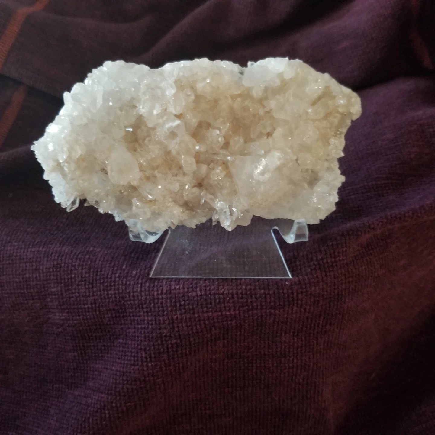 Selling a beautiful white crystal cluster displayed on a clear stand. It's a unique decorative piece that catches the light nicely. Perfect for adding a touch of natural beauty to any room