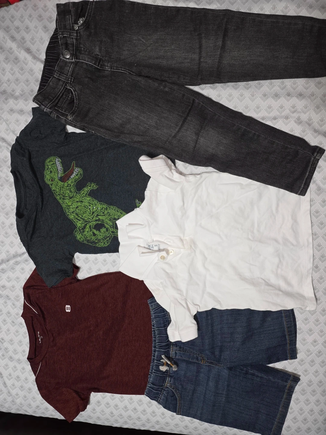 A nice bundle of boys clothes, size 5! Includes a pair of black jeans, a dinosaur t-shirt, a maroon athletic shirt, a pair of denim shorts, and a white polo shirt