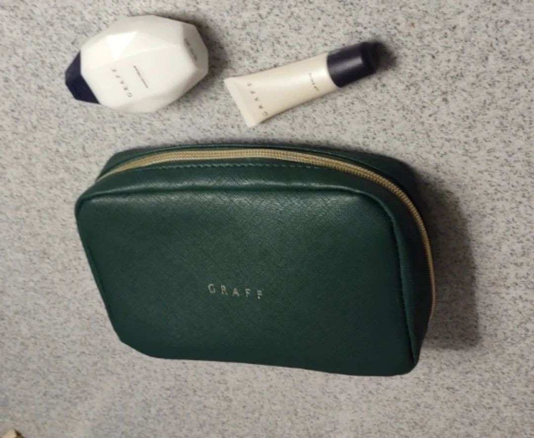 It includes a green cosmetic bag