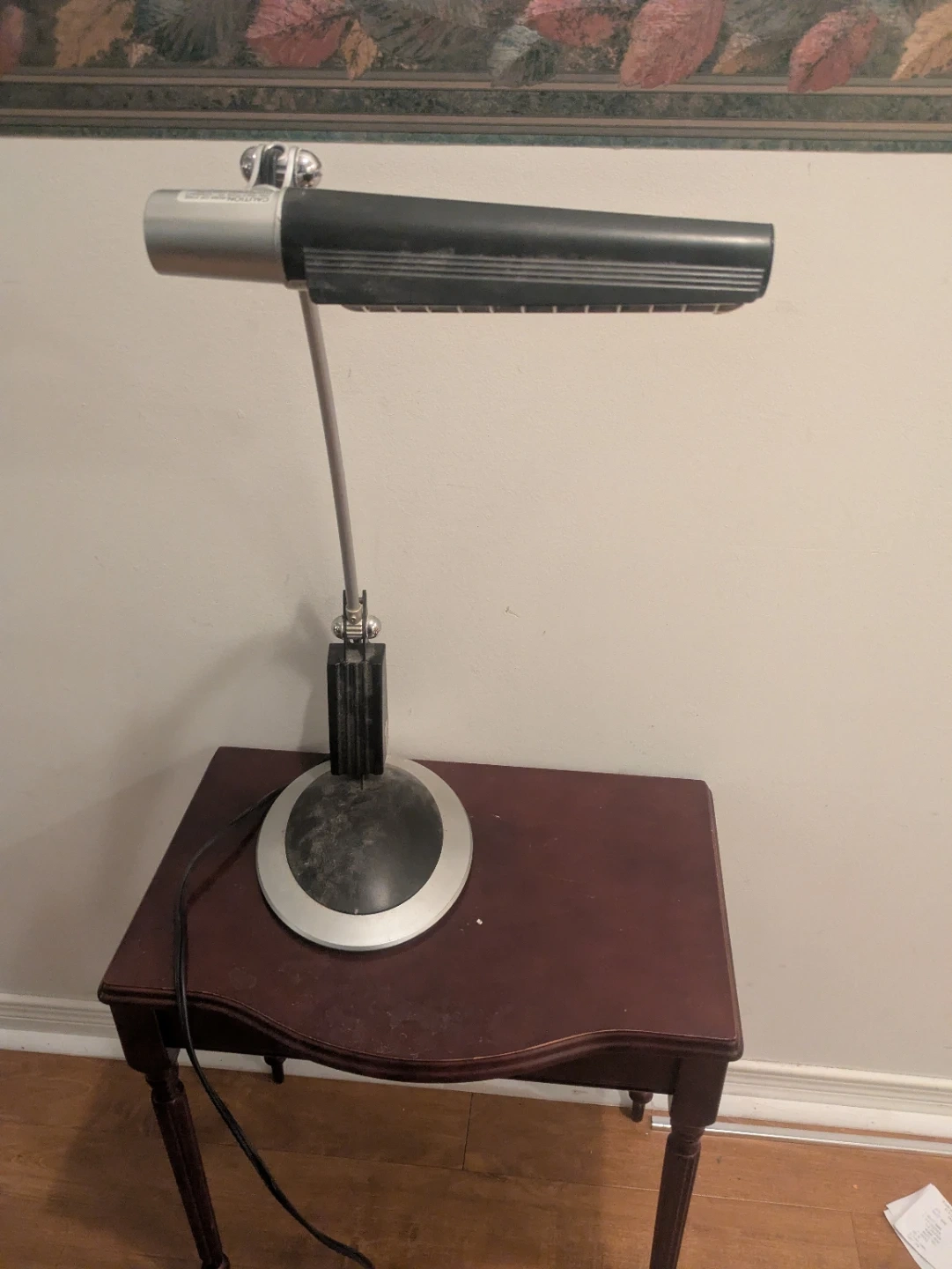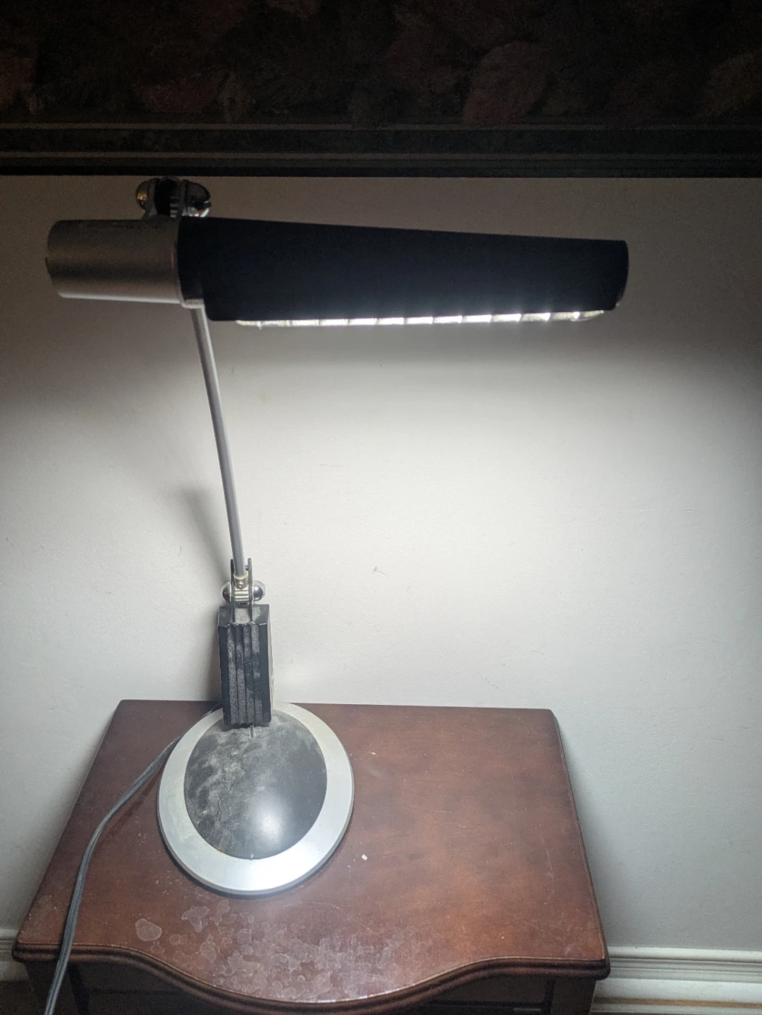 Selling a vintage desk lamp with a sleek black and silver design. It's in good condition and would look great on any desk or table. Perfect for adding a touch of retro style to your workspace
