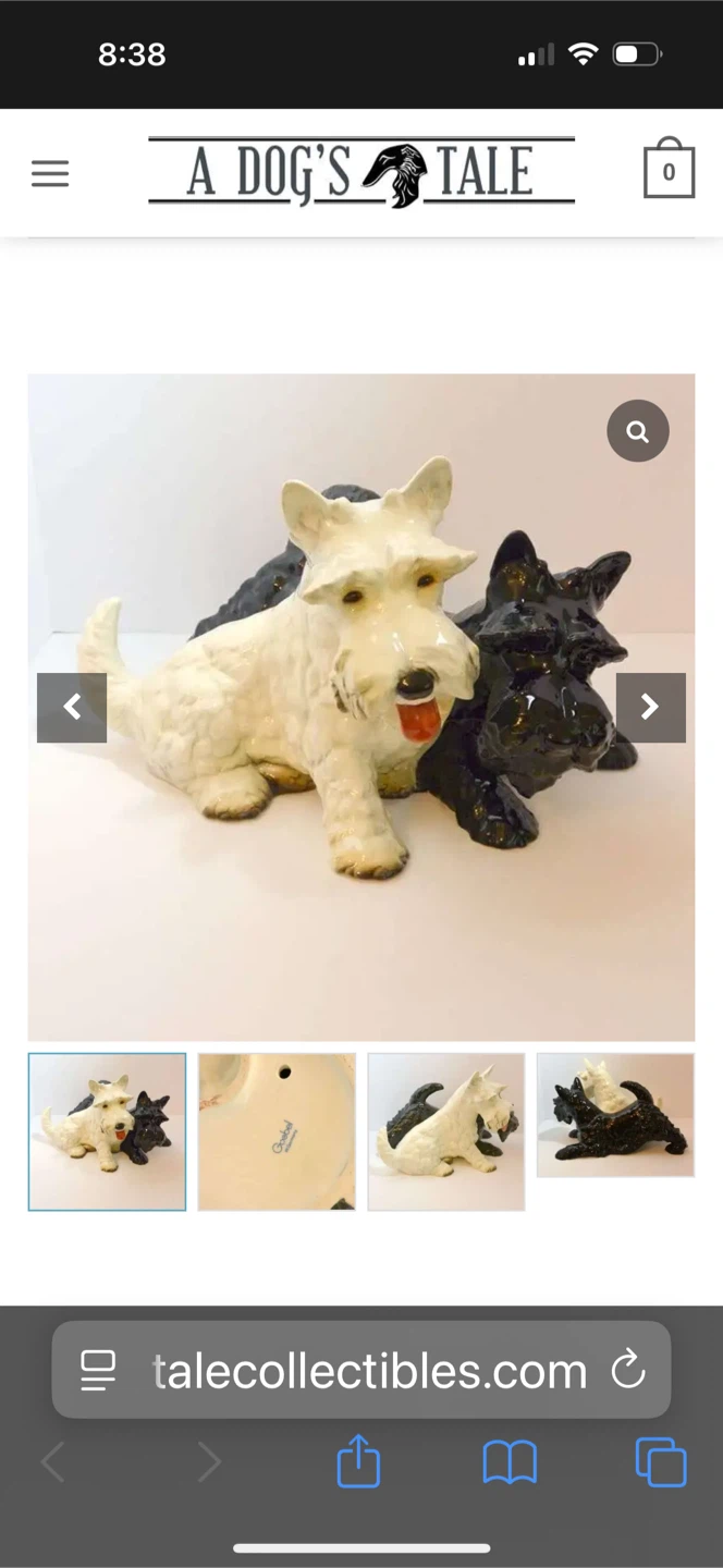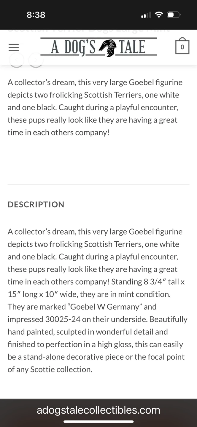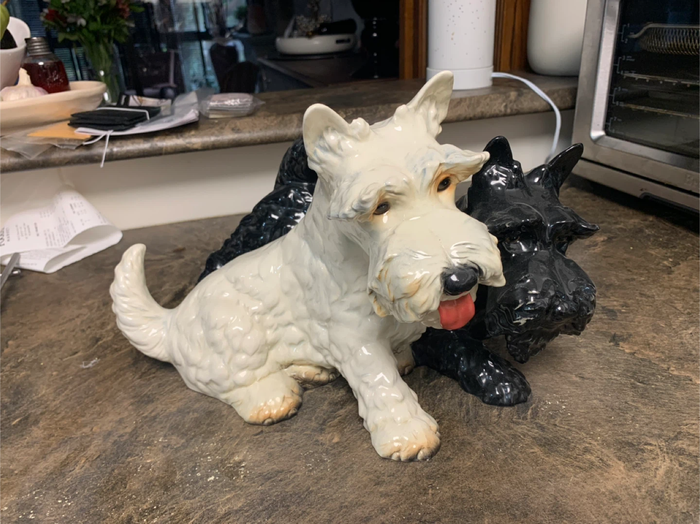 This Goebel figurine features two adorable Scottish Terriers, one white and one black. It's quite large, standing at 8 3/4" tall x 15" long x 10" wide. Marked "Goebel W Germany" and impressed 30025-24 on the underside. A beautiful piece to add to any Scottie collection