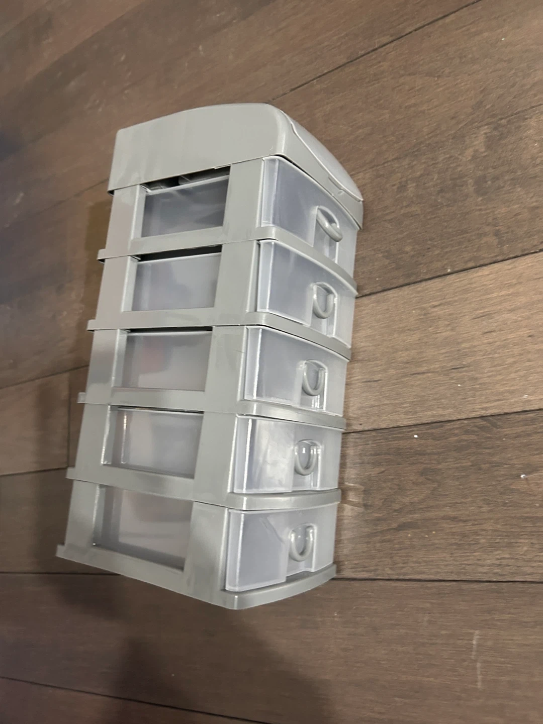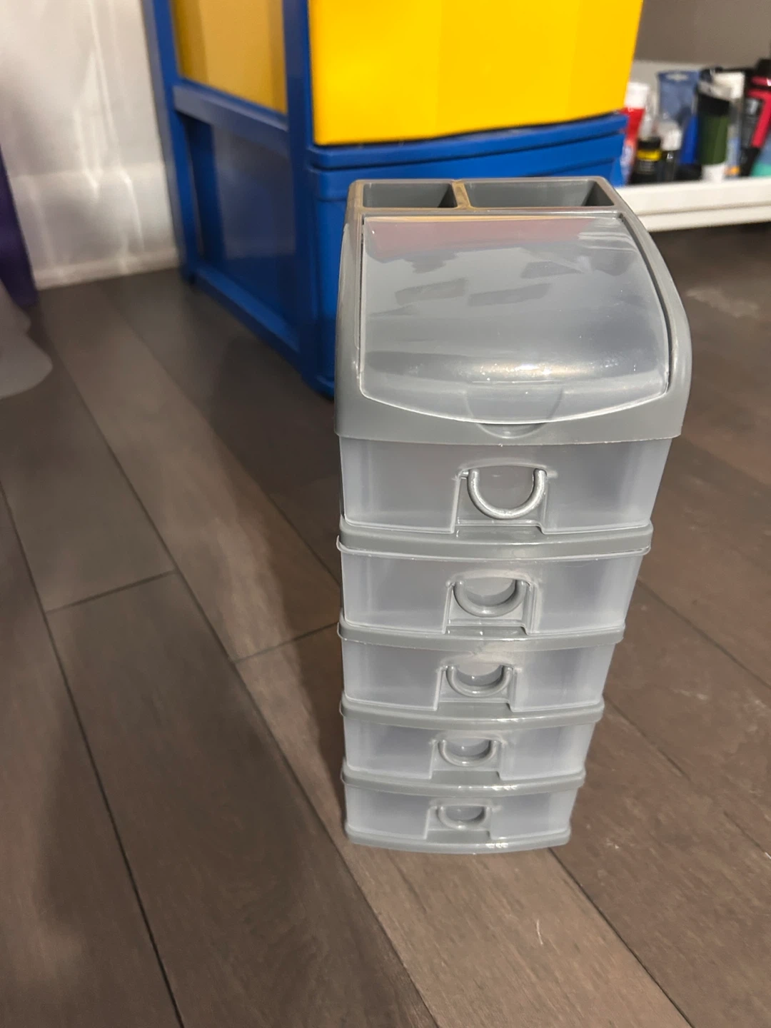 Here's a handy little gray plastic organizer with four drawers! It's perfect for storing small items and keeping things tidy. It's in great condition and ready to help you get organized