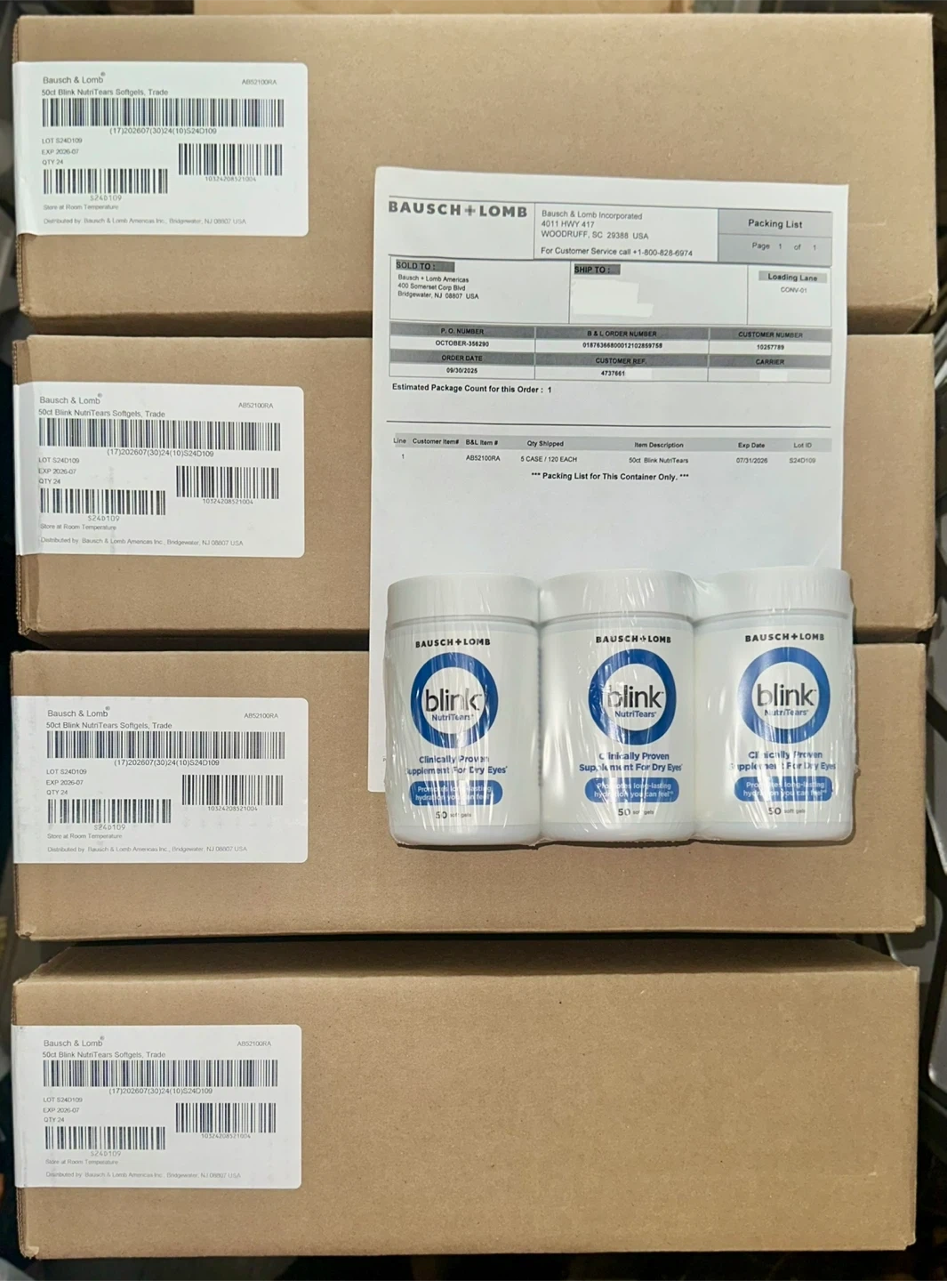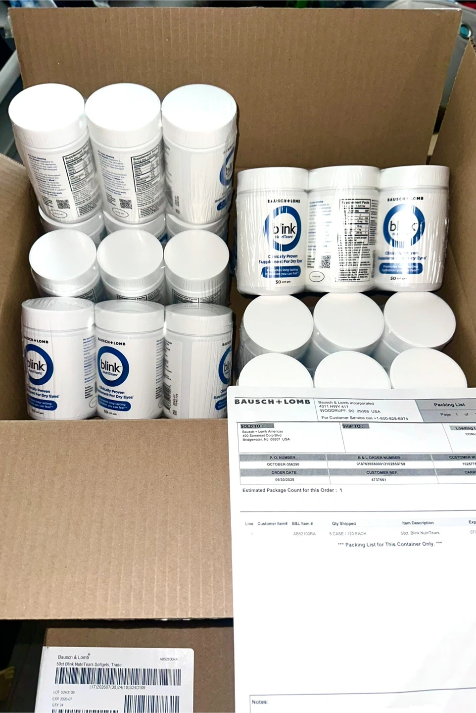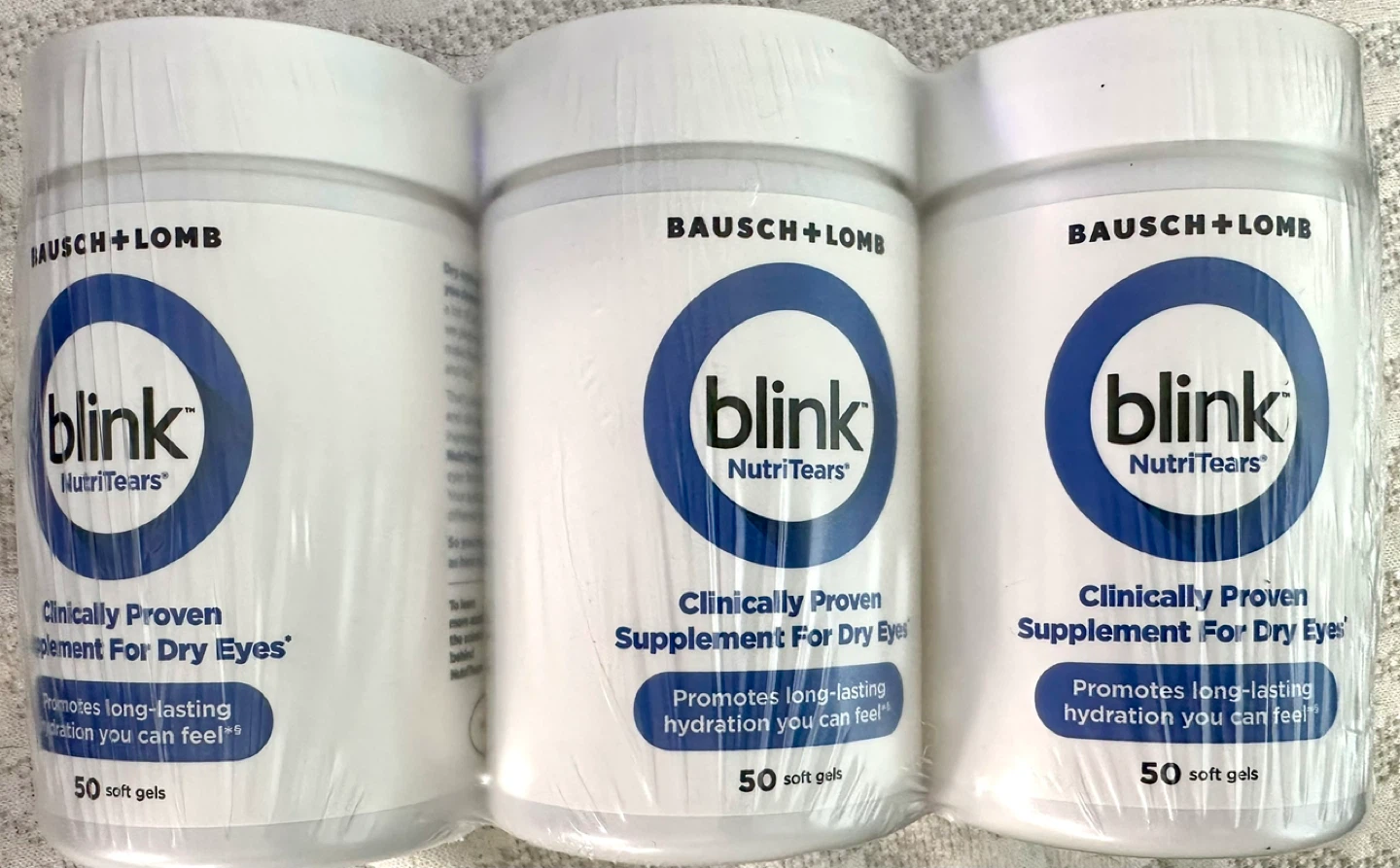 Selling a pack of Bausch + Lomb Blink NutriTears clinically proven supplement for dry eyes. Each bottle contains 50 soft gels that promote long-lasting hydration. The expiration date is in 2026 July 07.