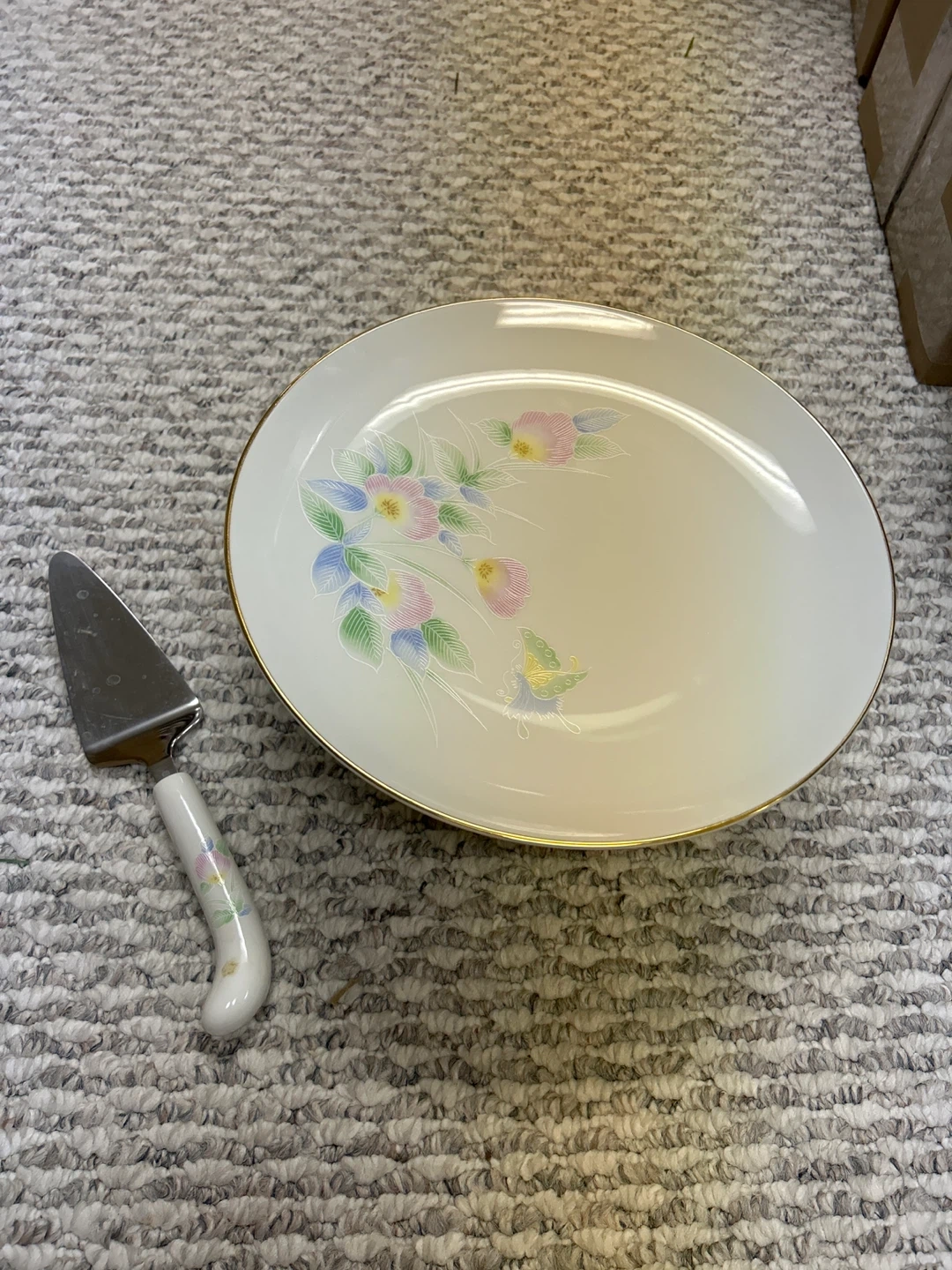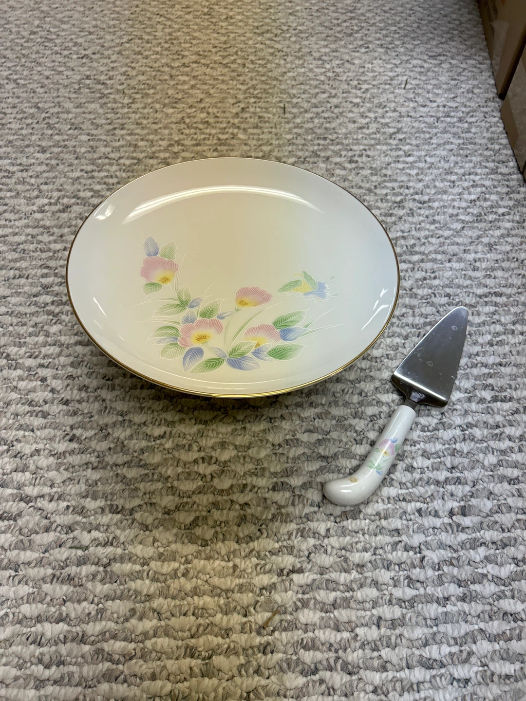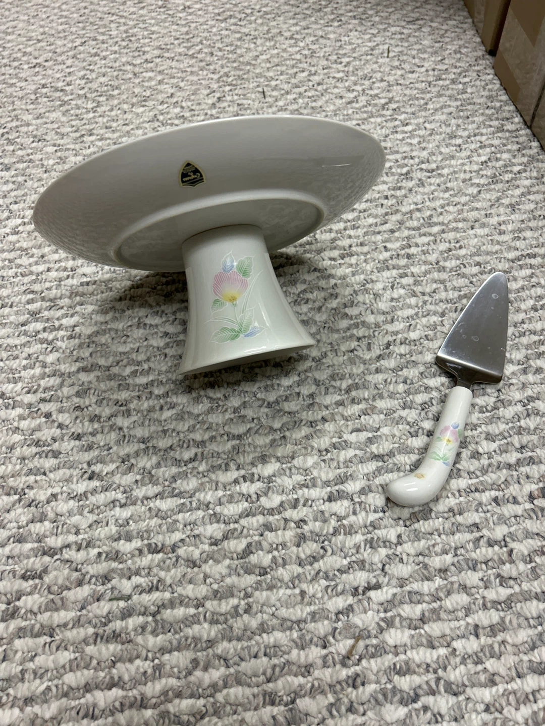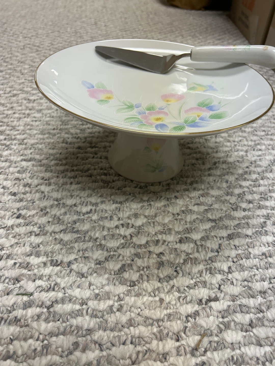 Selling a lovely vintage porcelain cake stand with a matching server. It features a delicate floral design with pink, yellow, and blue flowers, and a gold trim. Perfect for displaying your favorite cakes and desserts!