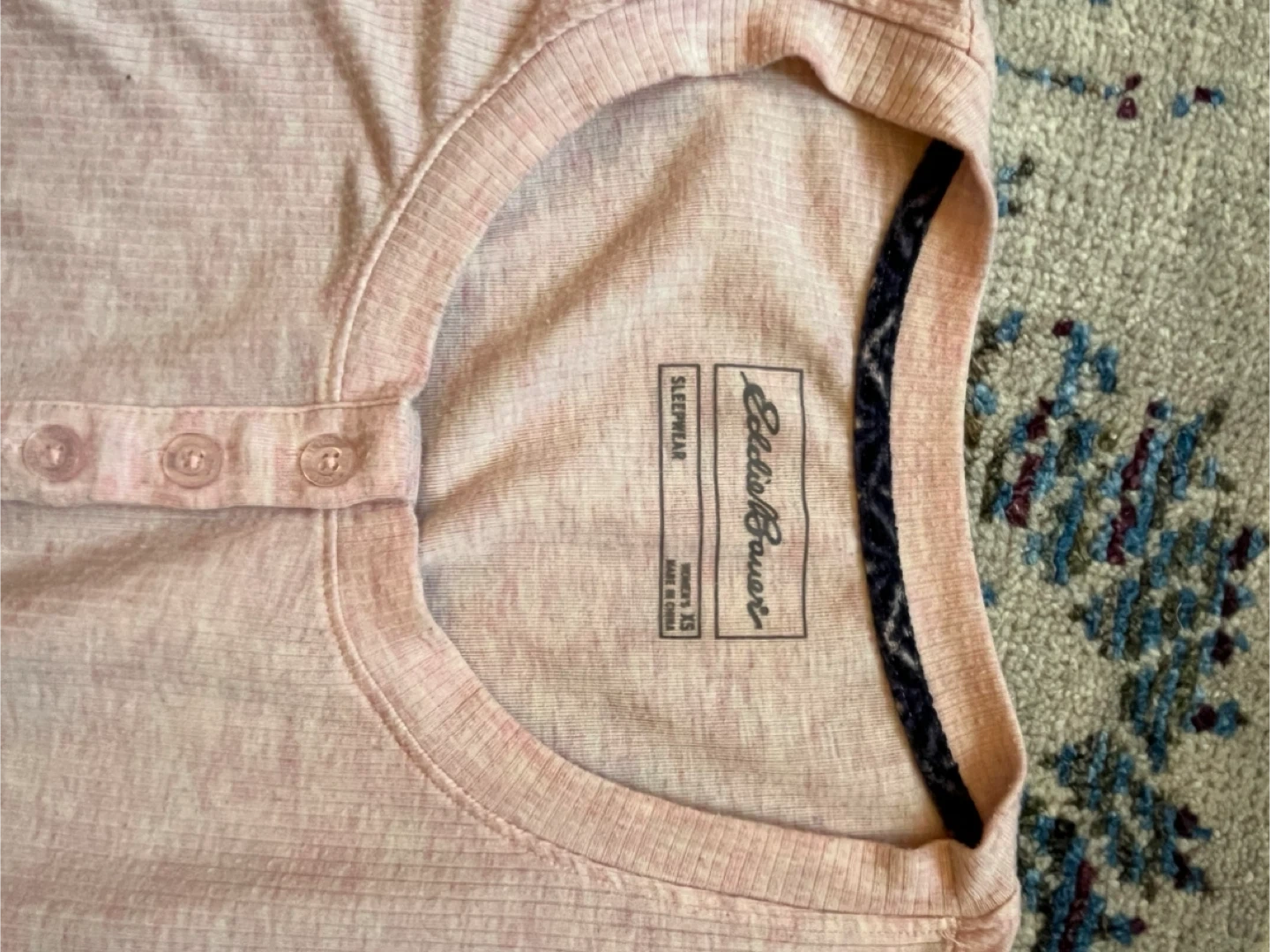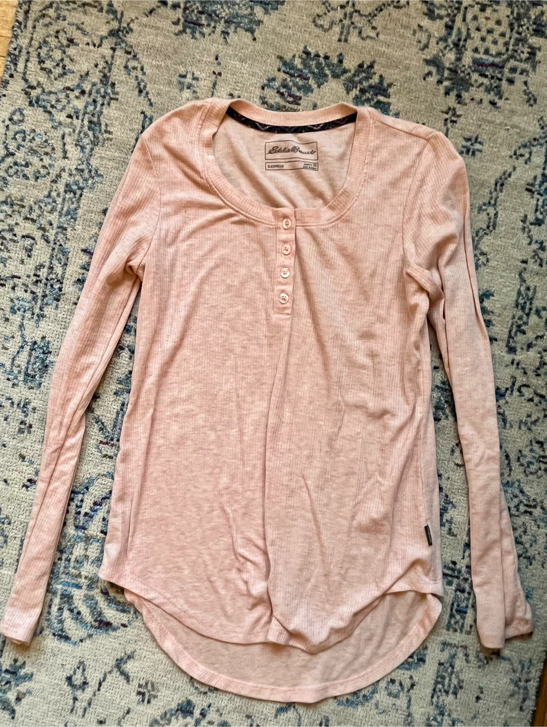 Selling a cute Eddie Bauer sleepwear top in size XS. It's a light pink colour and has a Henley-style button-up neckline. Perfect for cozy nights!