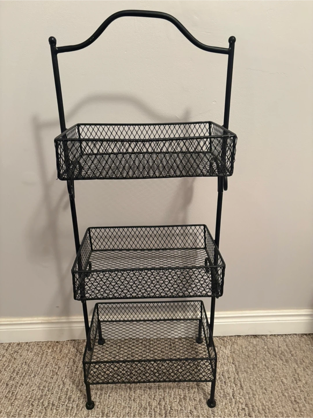 handy black metal wire basket shelf! It has three tiers, perfect for organizing things in your kitchen, bathroom, or anywhere you need a little extra storage.