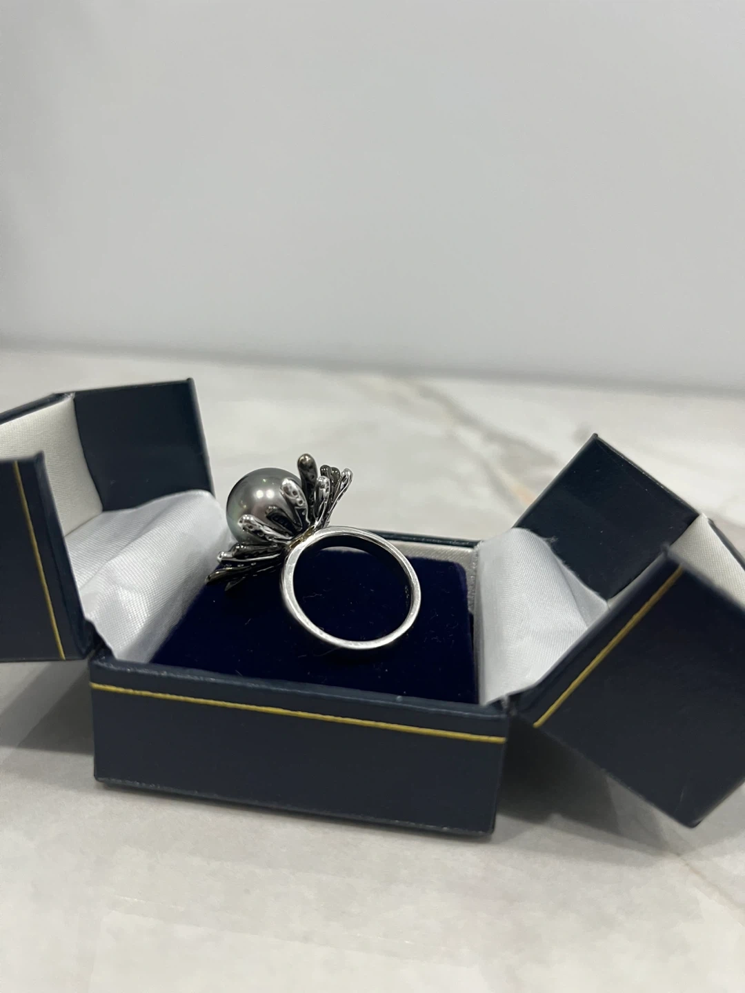 Selling a beautiful Tahitian pearl and diamond ring! It comes with its original box and a certificate of authenticity. The certificate indicates the ring is made of 18KT white gold and features a Tahitian pearl (13.3mm to 13.5mm in size) and diamonds. The pearl is described as having a unique colour, lustre, gem, and surface. The ring also features 38 round brilliant cut diamonds, with a total weight of 0.25 carats. The clarity of the diamonds is VS to SI-1, and the cut is good. The certificate estimates the replacement value at $6890 CDN).