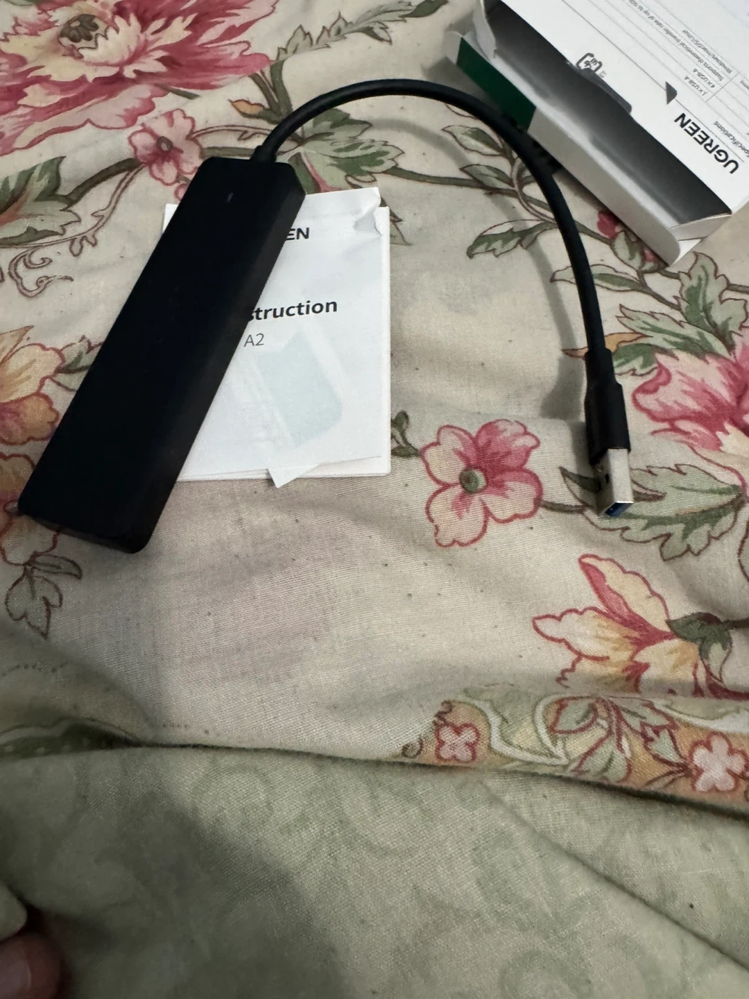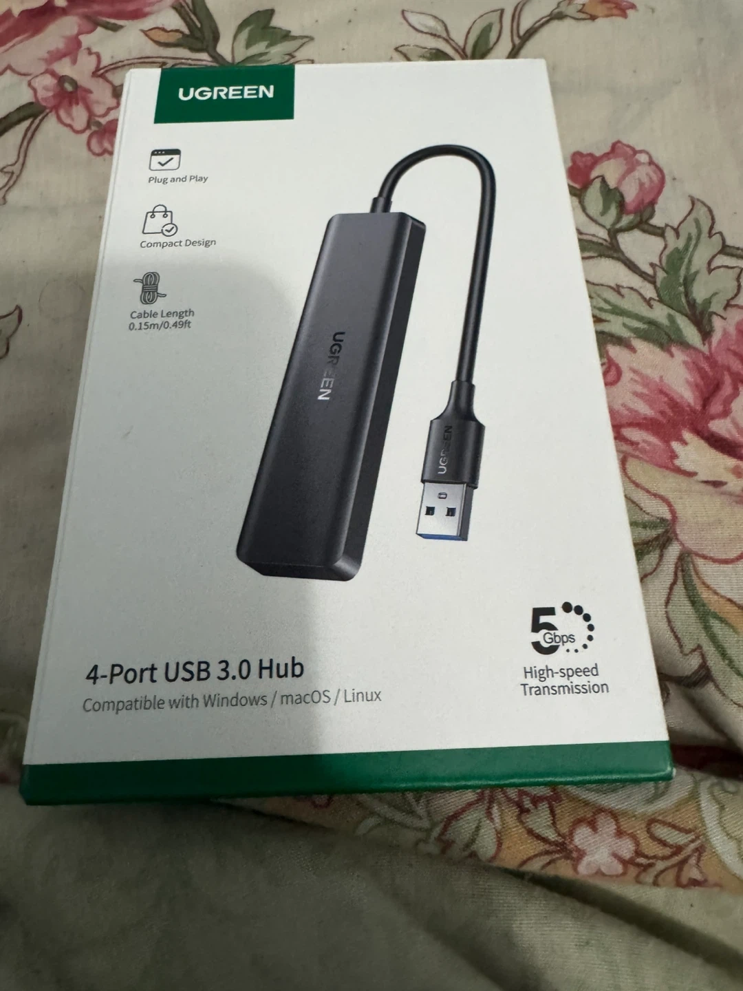 Selling a UGREEN 4-Port USB 3.0 Hub in excellent condition! It's compatible with Windows, macOS, and Linux. It supports a theoretical transfer rate of up to 5Gbps. It is plug and play ready with a compact design and a cable length of 0.15m/0.49ft. The box and user instruction A2 are included