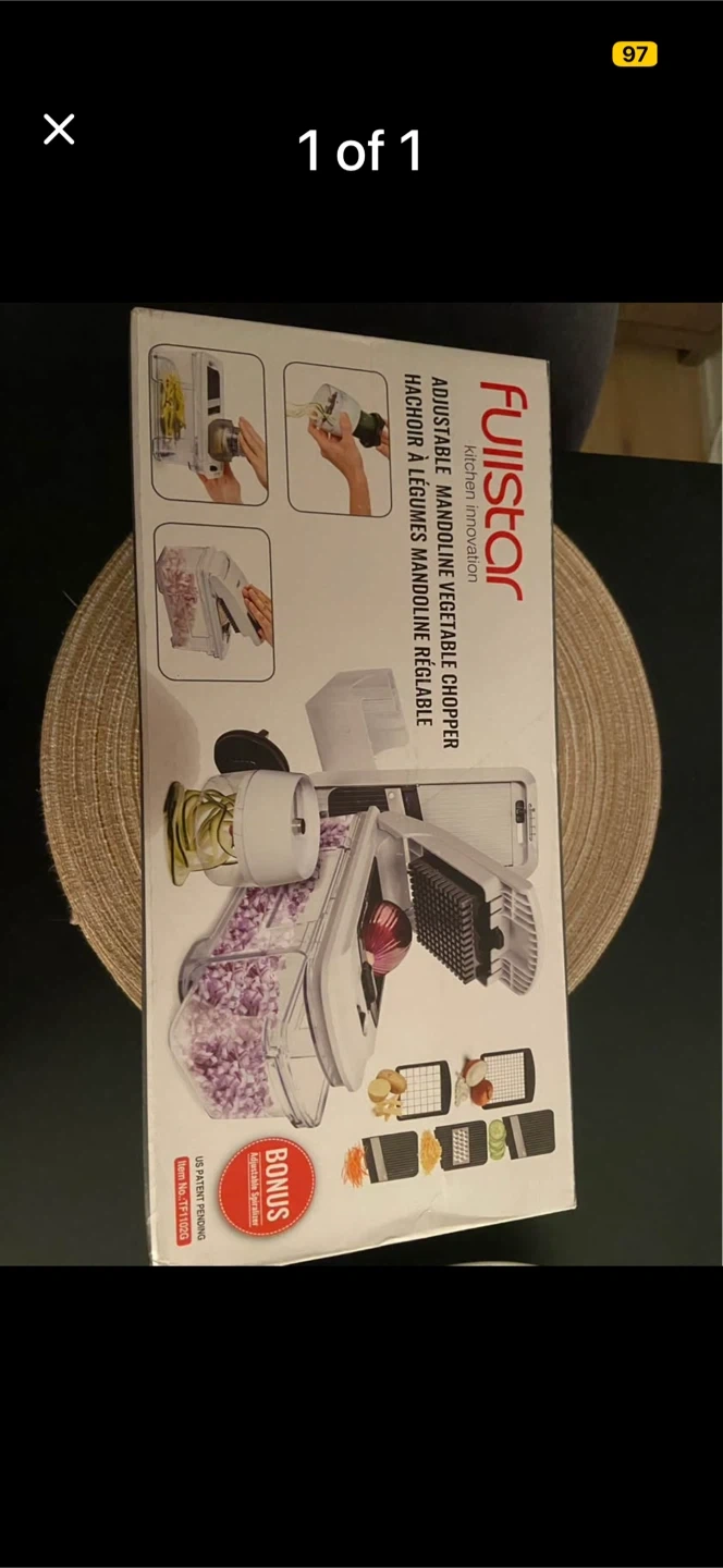 This Fullstar kitchen innovation is an adjustable mandoline vegetable chopper. It comes with a bonus adjustable spiralizer. Various blades are included for different cuts.