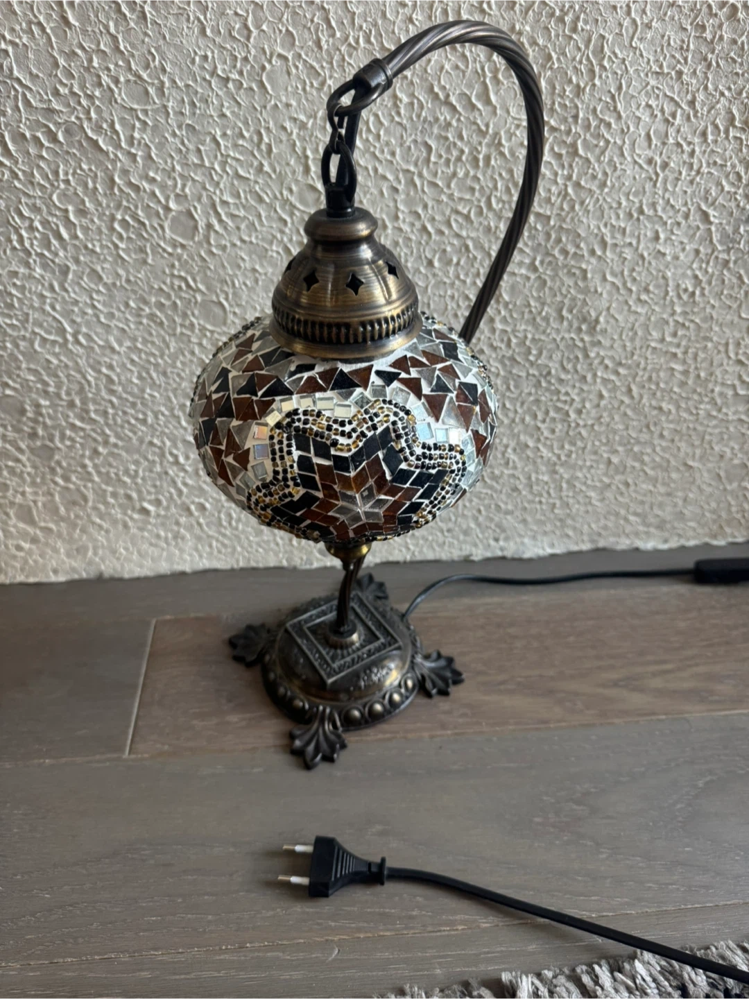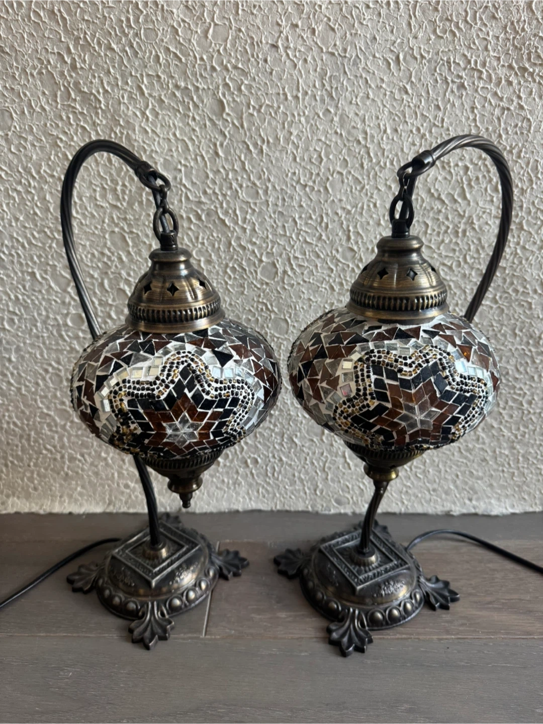 Beautiful pair of Turkish mosaic table lamps. Bronze metal base and curved arm. Mosaic globe shades have brown, black, and silver/white tiles.