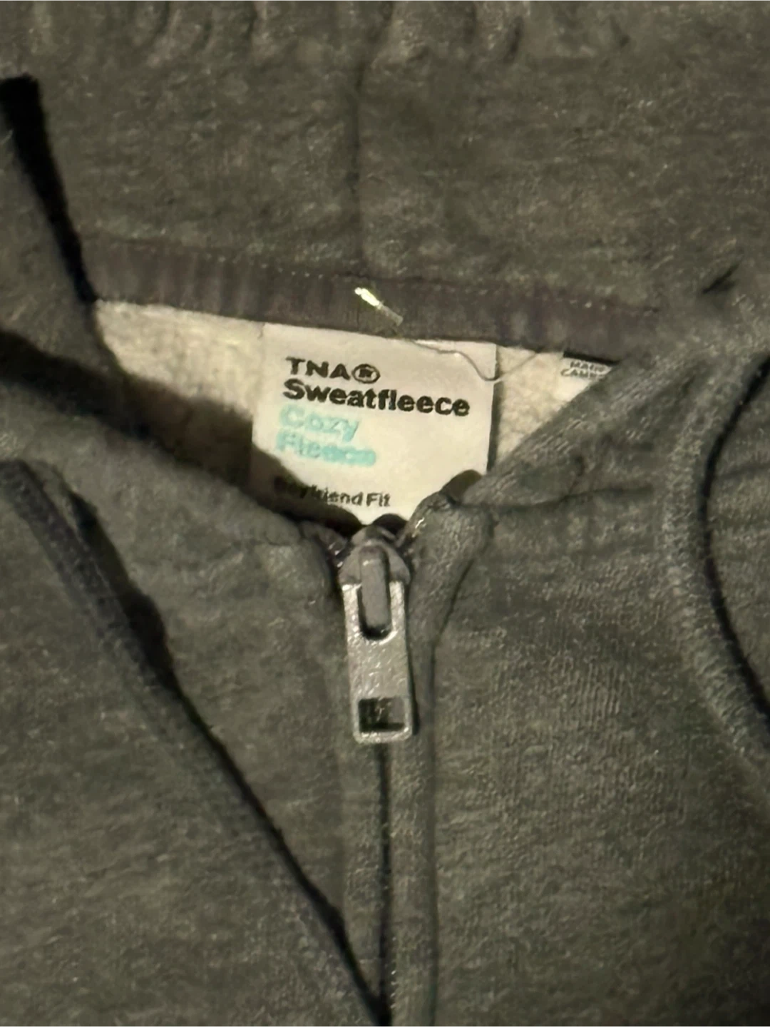 This TNA Cozy Fleece zip-up hoodie is made for comfort. It's a warm grey colour and has a relaxed fit. Great for layering on cooler days!