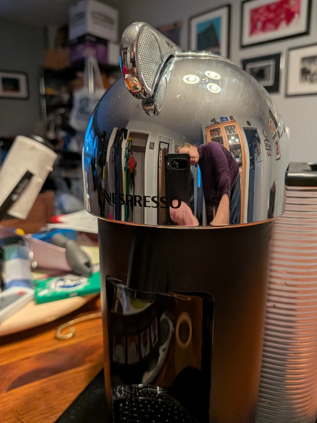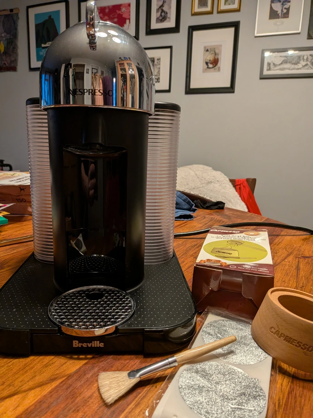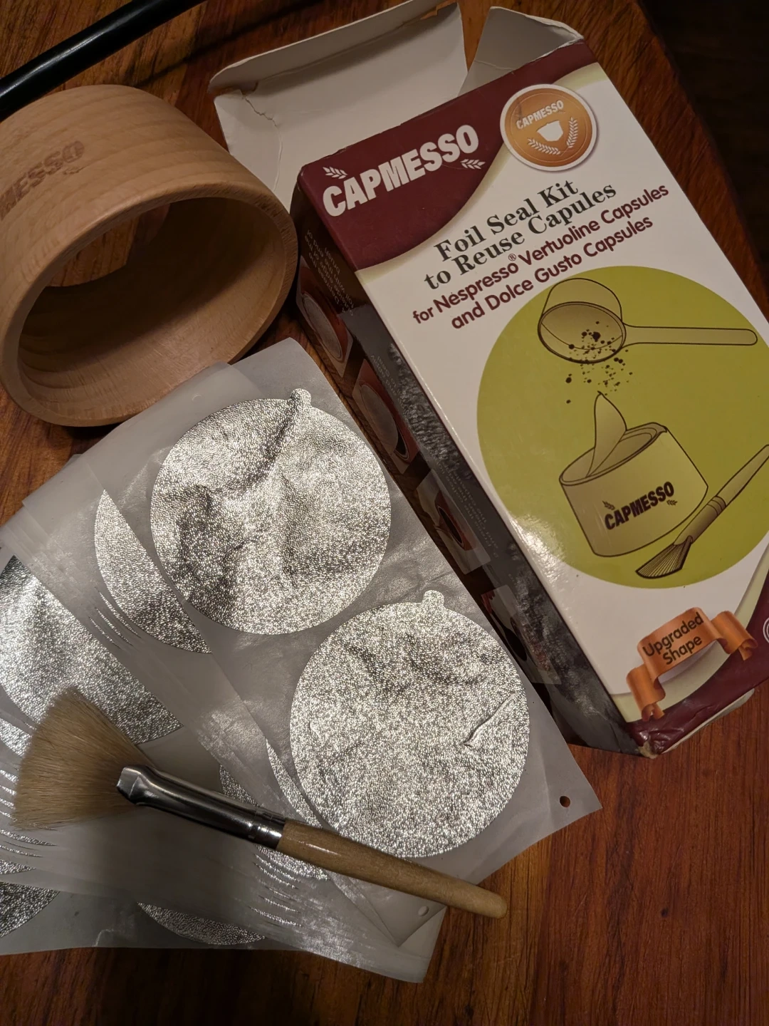 Includes kit to reuse coffee pods including brush, mold and foil covers ($25)
