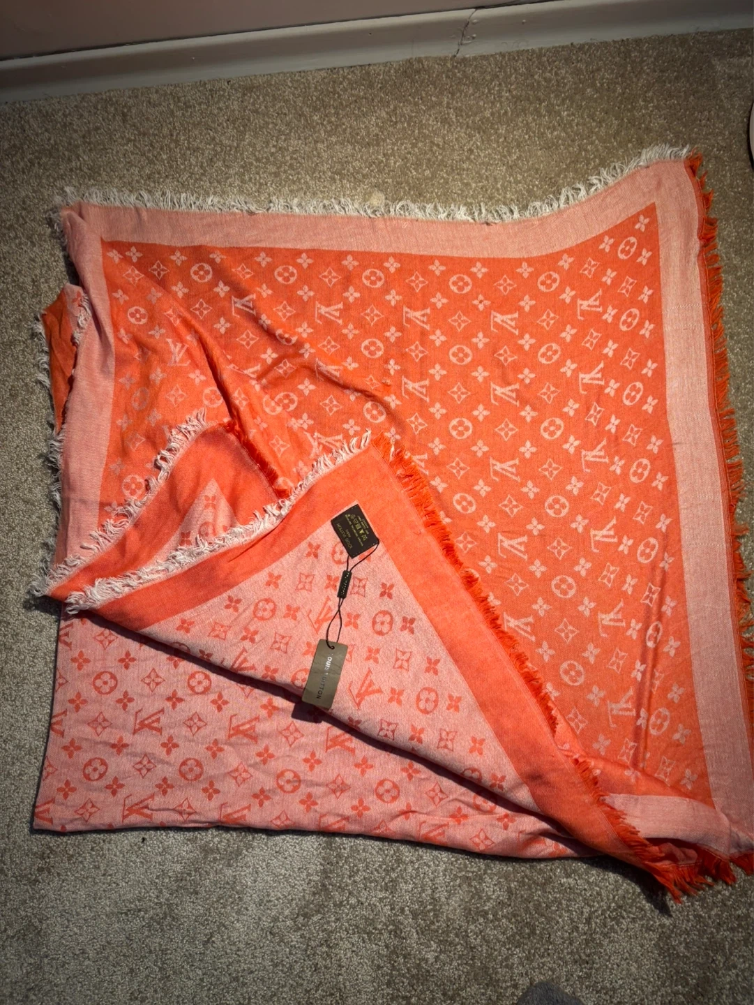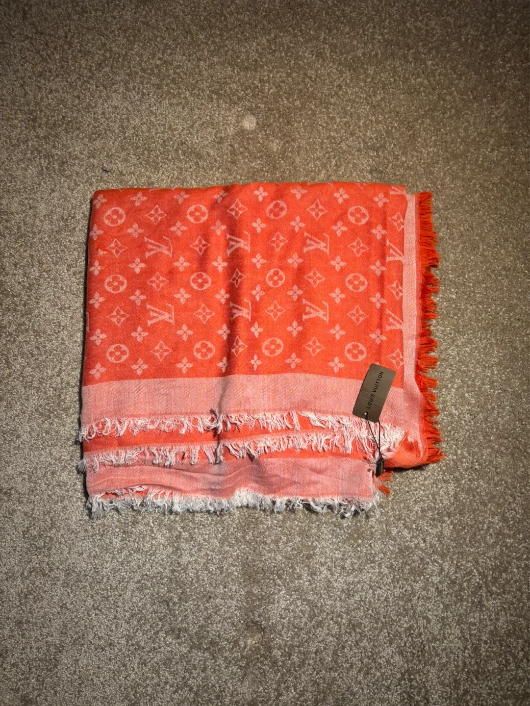 Orange Louis Vuitton scarf with iconic monogram pattern. Fringed edges add a stylish touch. Material appears to be a blend, suitable for various seasons.