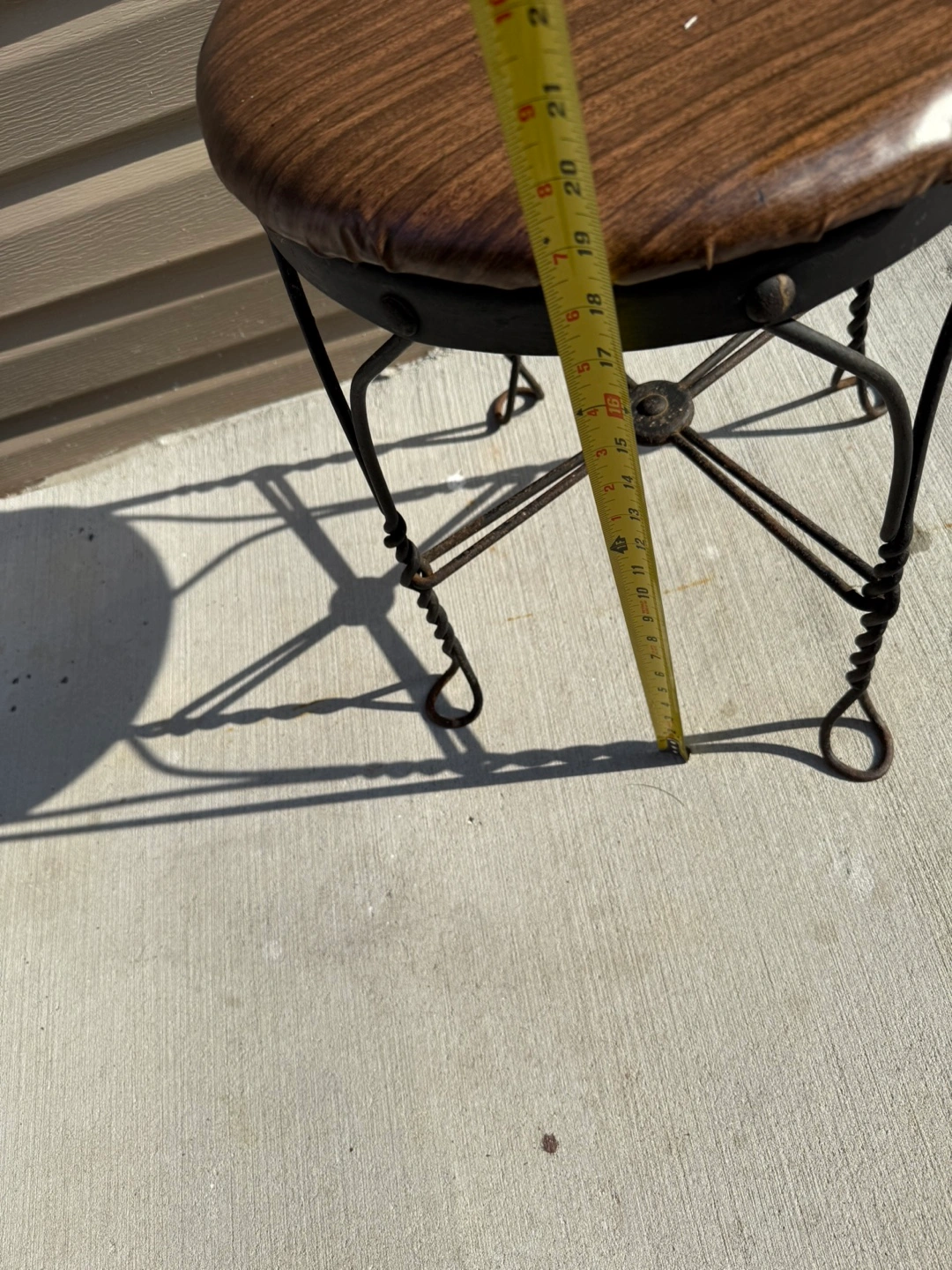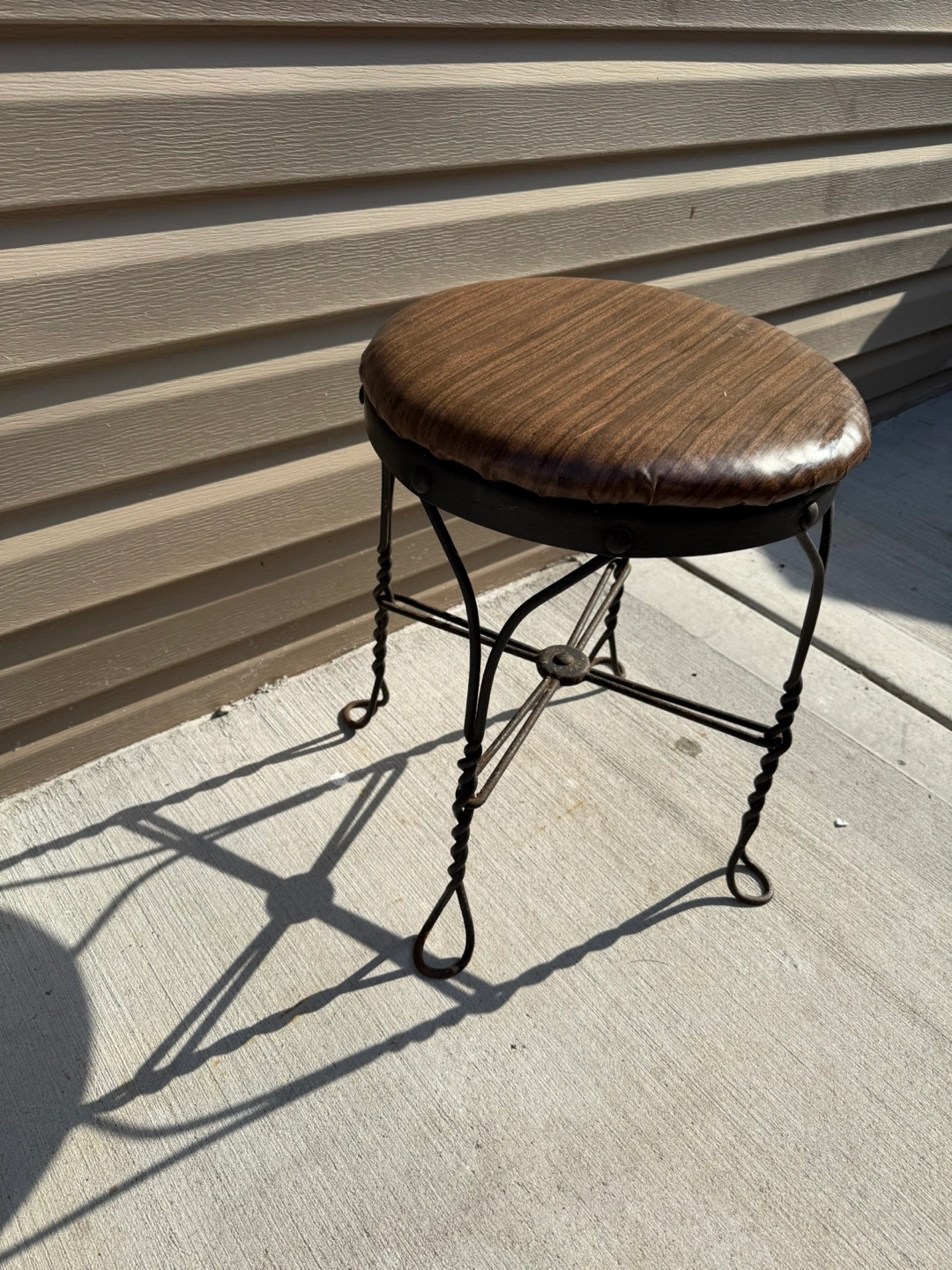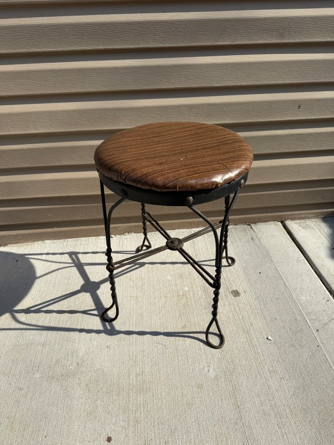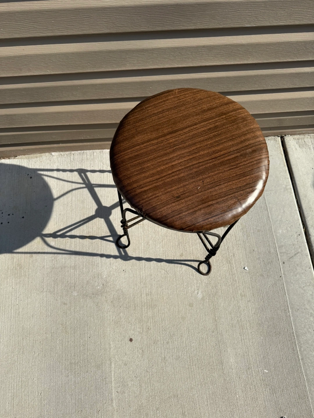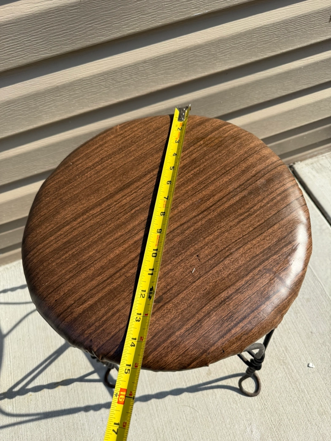 Selling a vintage-style stool! It features a brown wood-like top and a black metal frame. It stands approximately 18 inches tall. Perfect for adding a touch of retro charm to any room
