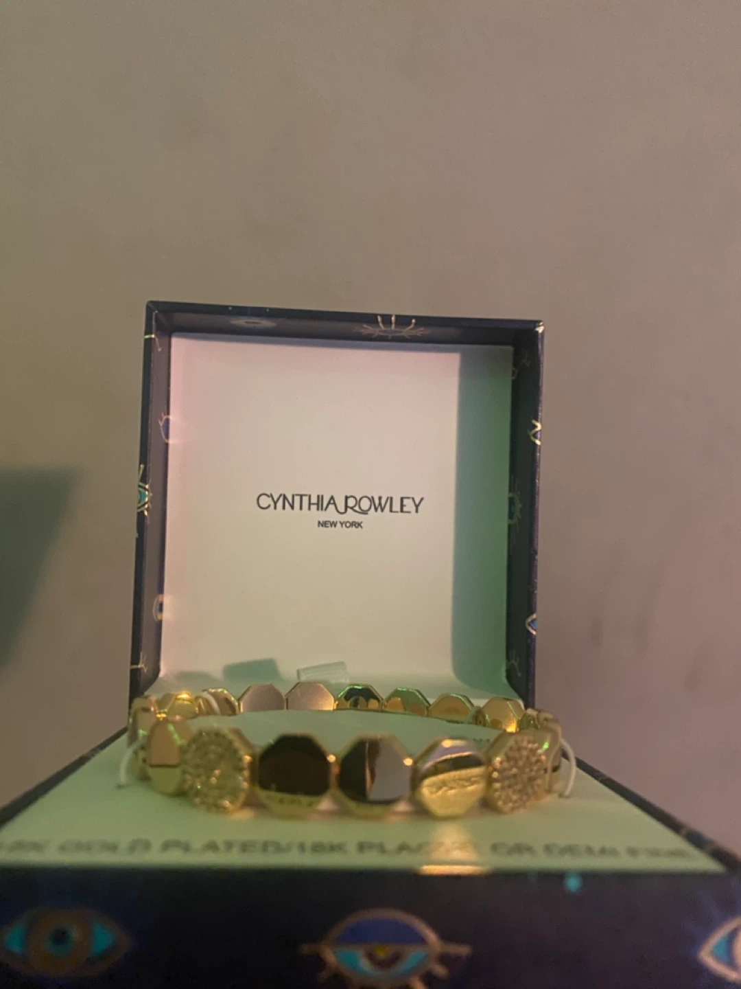Beautiful gold-toned stretch bracelet from Cynthia Rowley New York. It's made with a gold plated finish and features a mix of polished and textured hexagonal links. Comes in its original box!