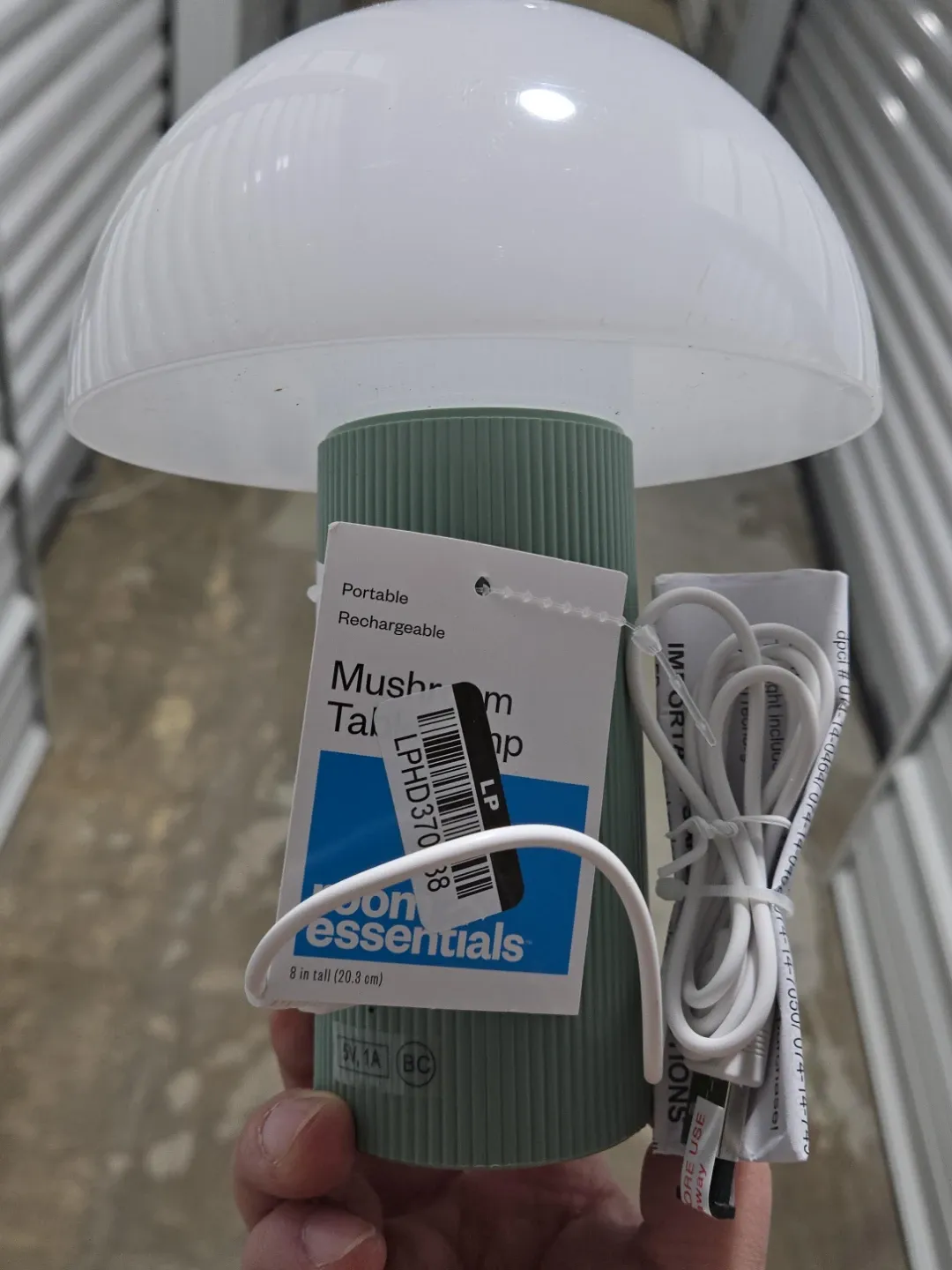 This is a portable, rechargeable, mushroom-shaped table lamp. It's 15 inches tall.includes a charging cable and is touch-activated with a soft yellow light, perfect for bedtime or for when light is needed