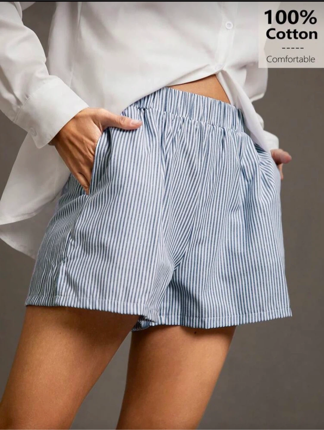 Striped shorts made from 100% cotton. These shorts have an elastic waistband and a comfortable fit. They're perfect for lounging around the house!