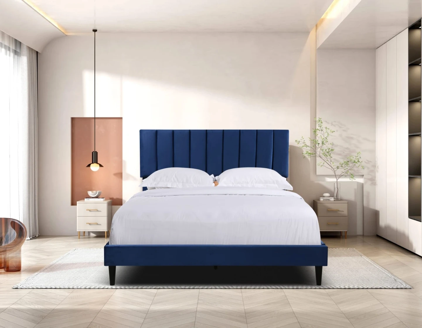 This platform bed frame features a stylish velvet upholstery with vertical channel tufting on the headboard. It's designed for durability and to provide excellent mattress support. The low-profile frame is a chic addition to any bedroom!